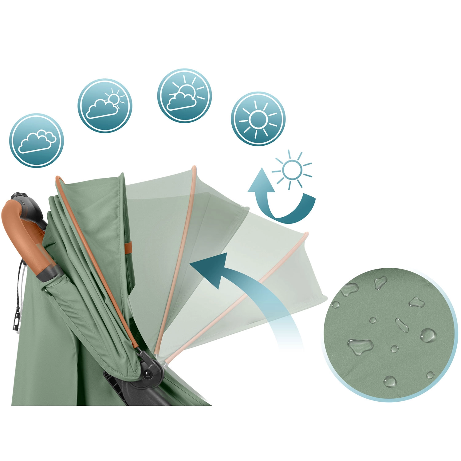 La capote extensible à positions multiples protège du soleil, du vent et d’une pluie légère. Tissu déperlant et ombrage modulable pour dormir ou observer les alentours.