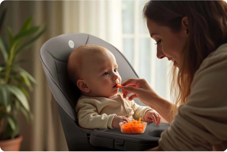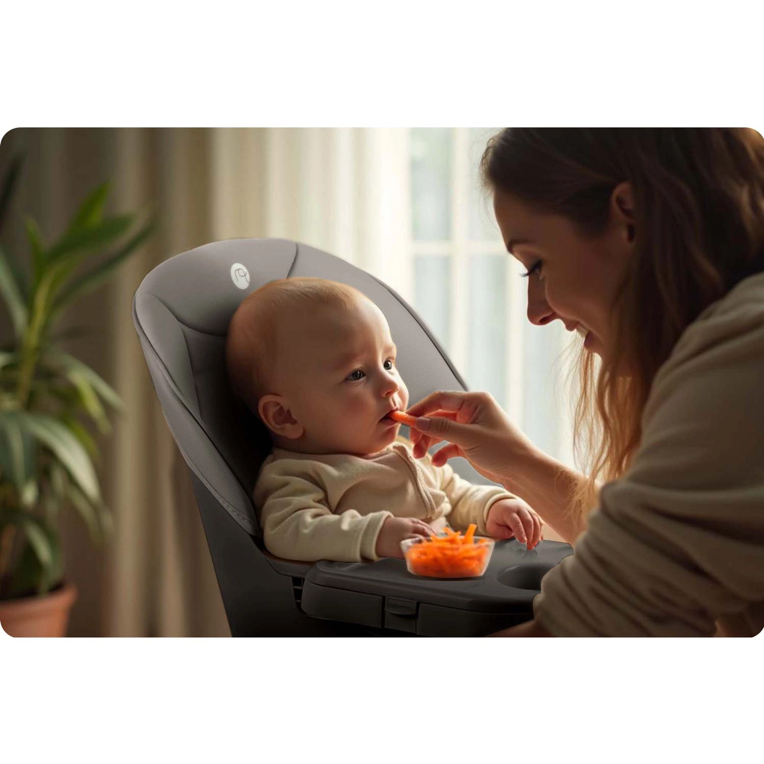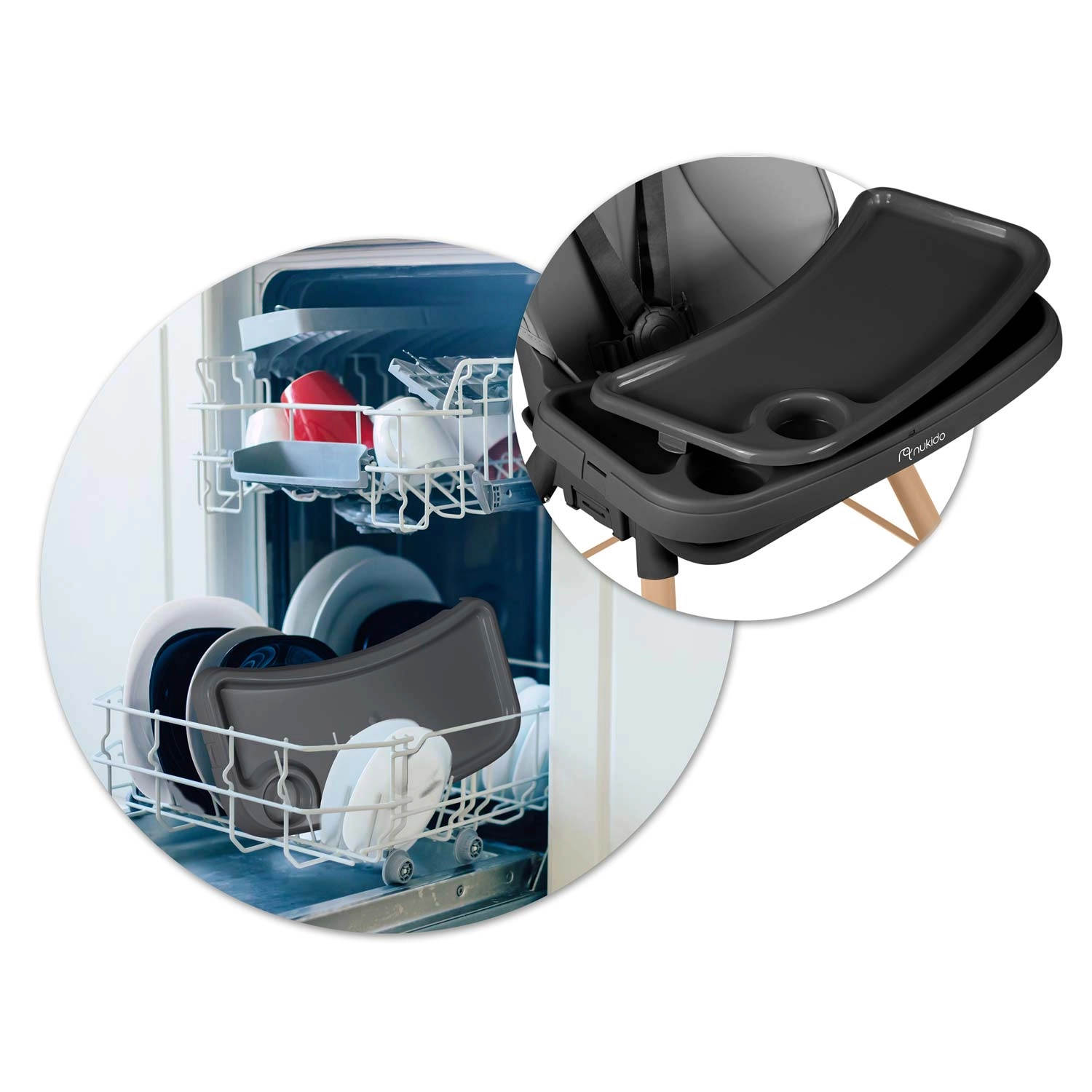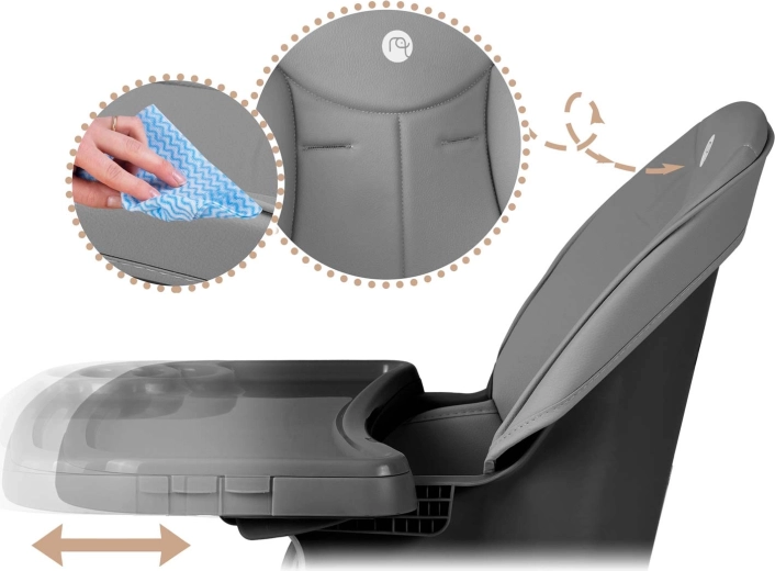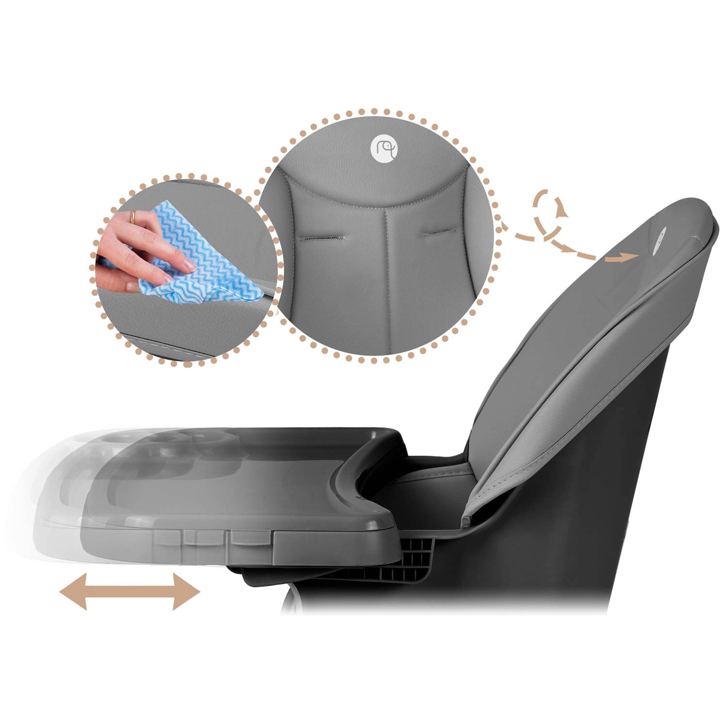 Le plateau principal est coulissant et entièrement amovible – avec insert pratique et bords surélevés anti‑débordement. Les surfaces se nettoient d’un chiffon humide, tandis que le plateau et l’insert peuvent aller au lave‑vaisselle. Pour une sécurité maximale : harnais 5 points et repose‑pieds rigide. La chaise est conforme à la norme européenne EN 14988.