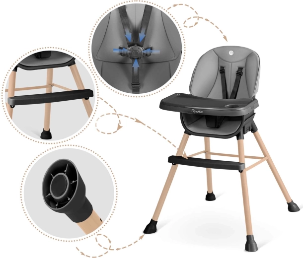 Des pieds stables avec patins antidérapants, un repose‑pieds solide et un harnais fiable à 5 points maintiennent l’enfant en sécurité et à l’aise pendant les repas et les jeux.