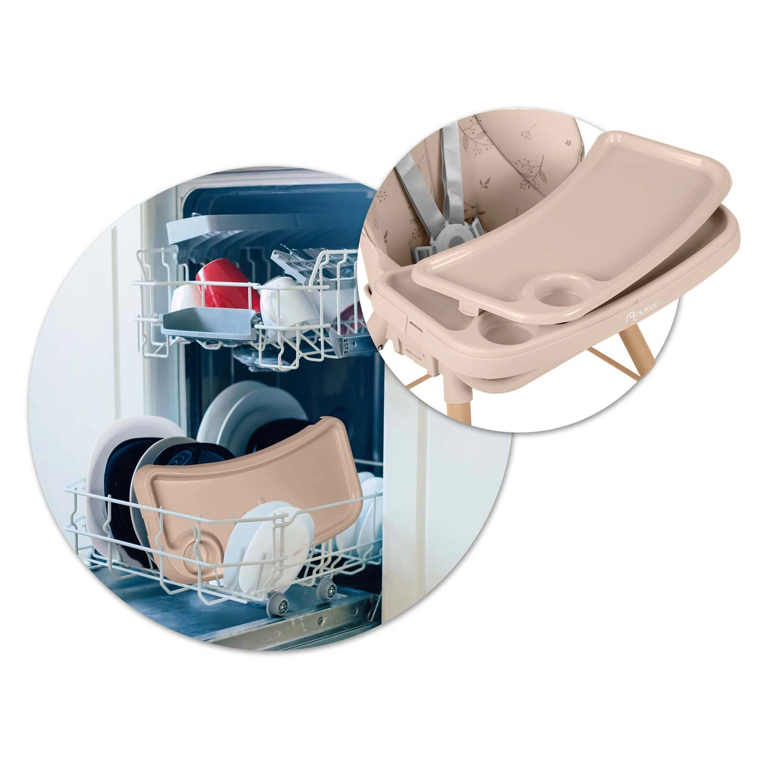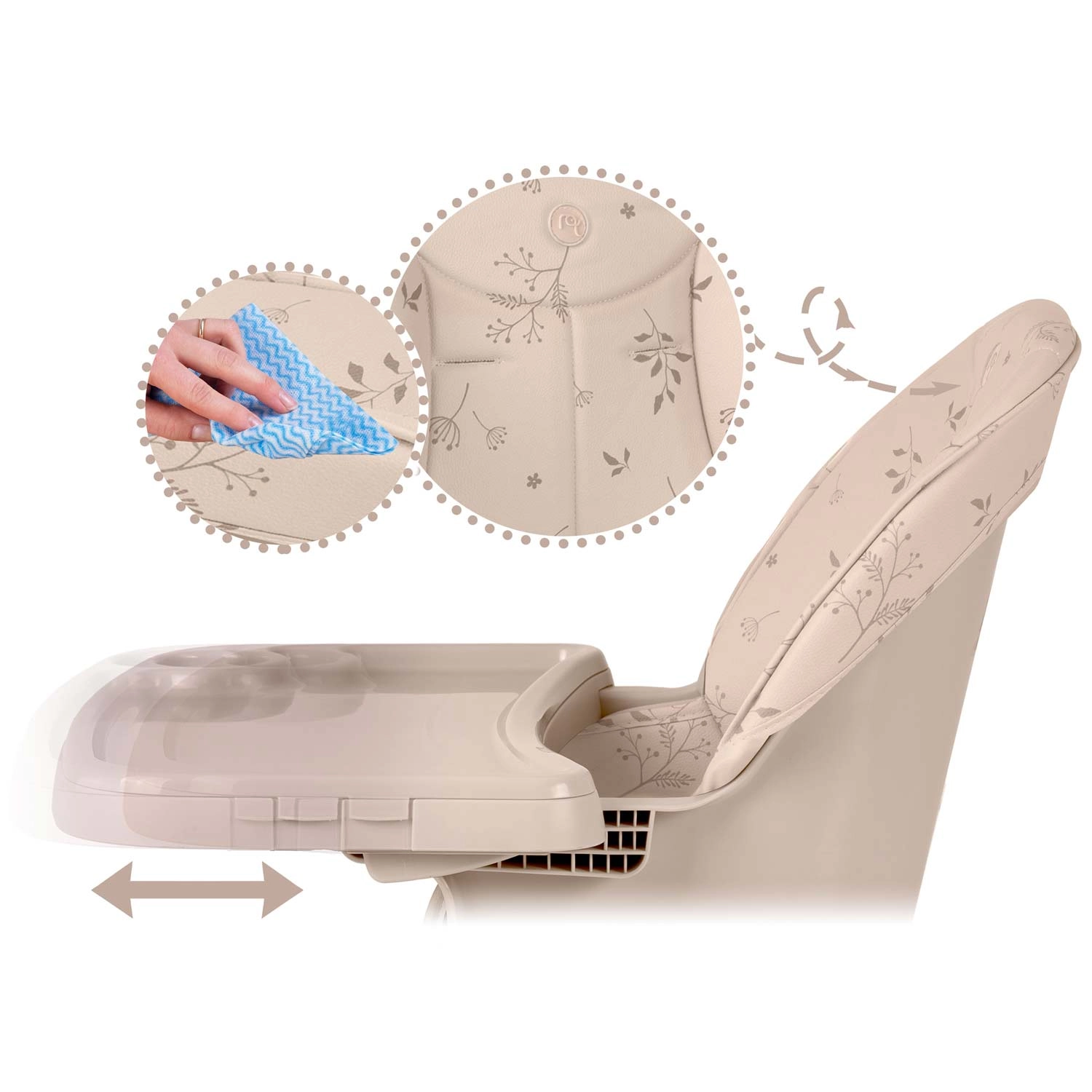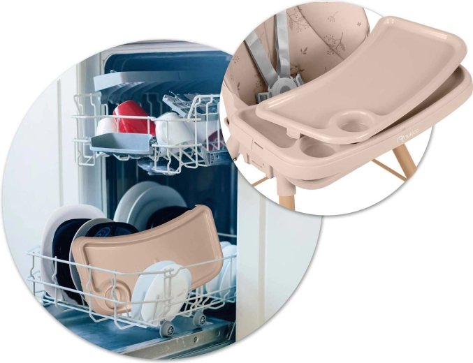 Le plateau avec sur-plateau amovible possède des bords relevés anti‑débordement et se nettoie sous l’eau courante ou au lave‑vaisselle. La housse n’absorbe pas les saletés – il suffit d’essuyer.