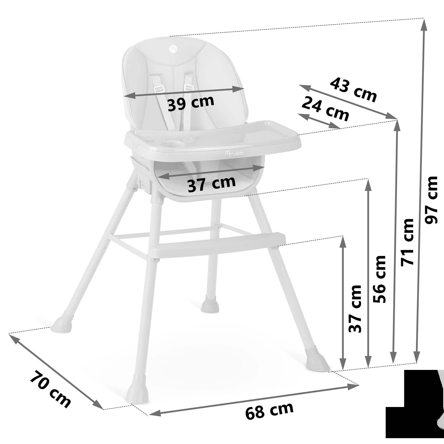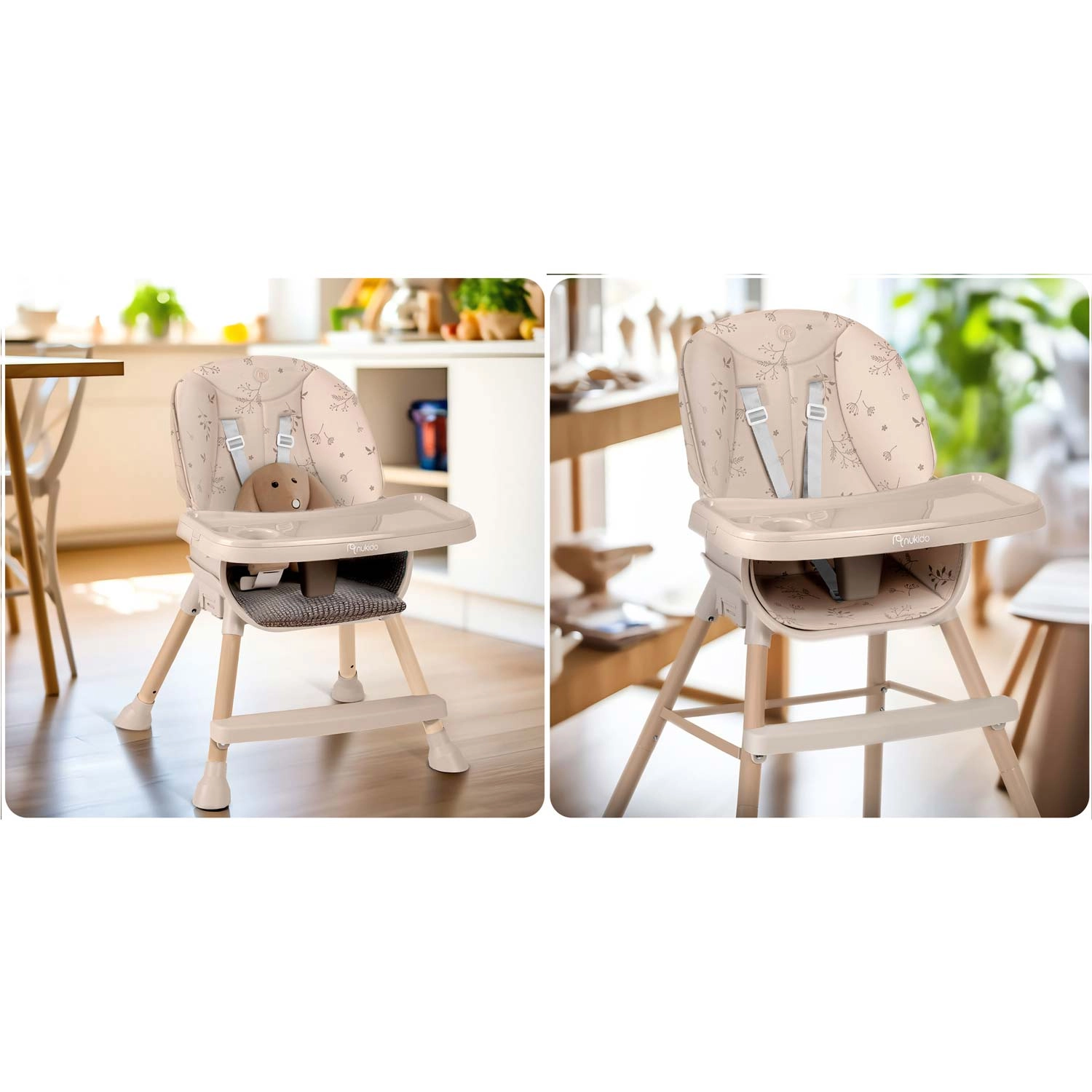 NUKIDO Tilo se transforme facilement d’une chaise haute en réhausseur avec plateau ou en petite chaise pour tout-petit. Une seule chaise pour manger, jouer et lire.