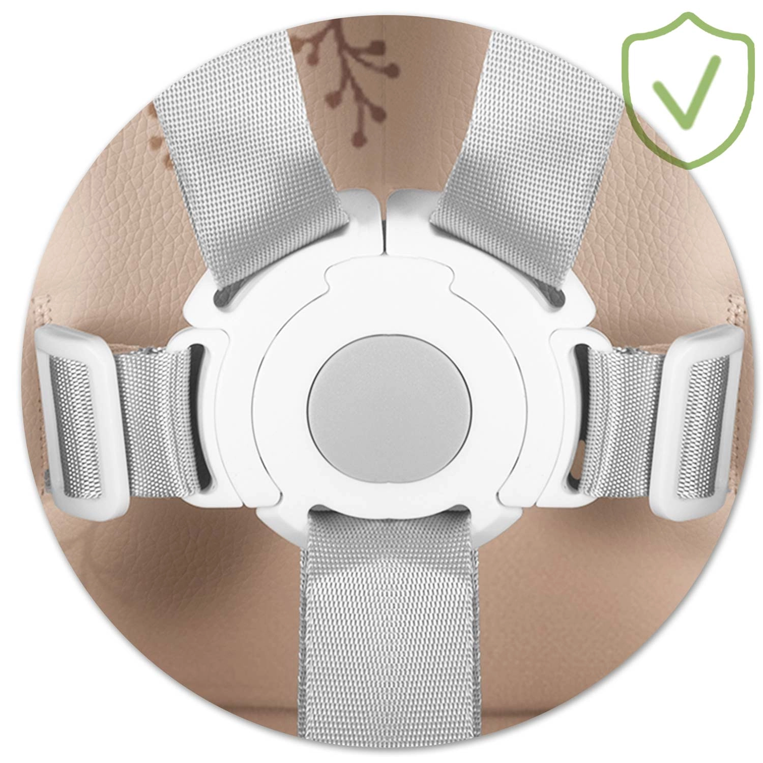 Le harnais de sécurité 5 points, le repose‑pieds robuste et les pieds larges avec embouts antidérapants maintiennent la chaise stable en place. Conforme à la norme EN 14988.