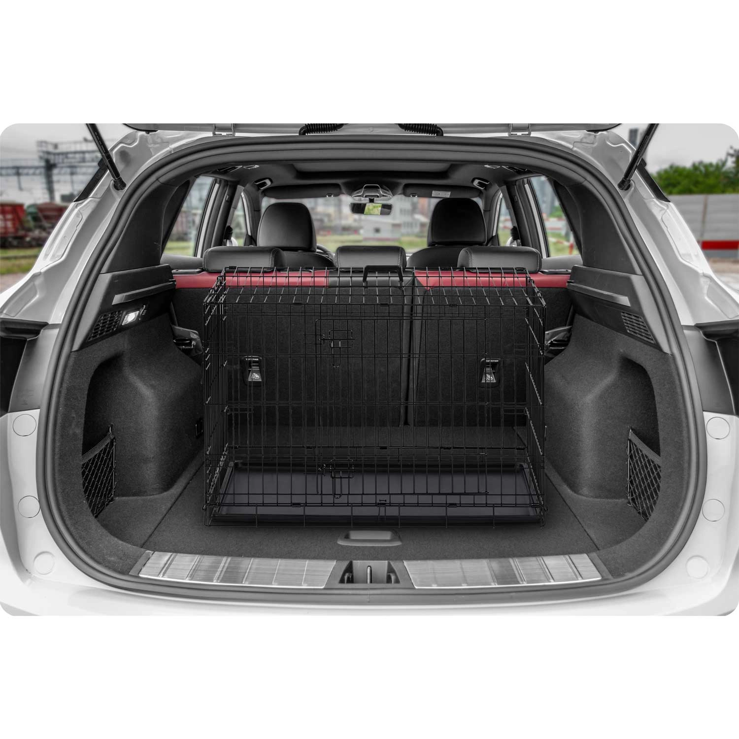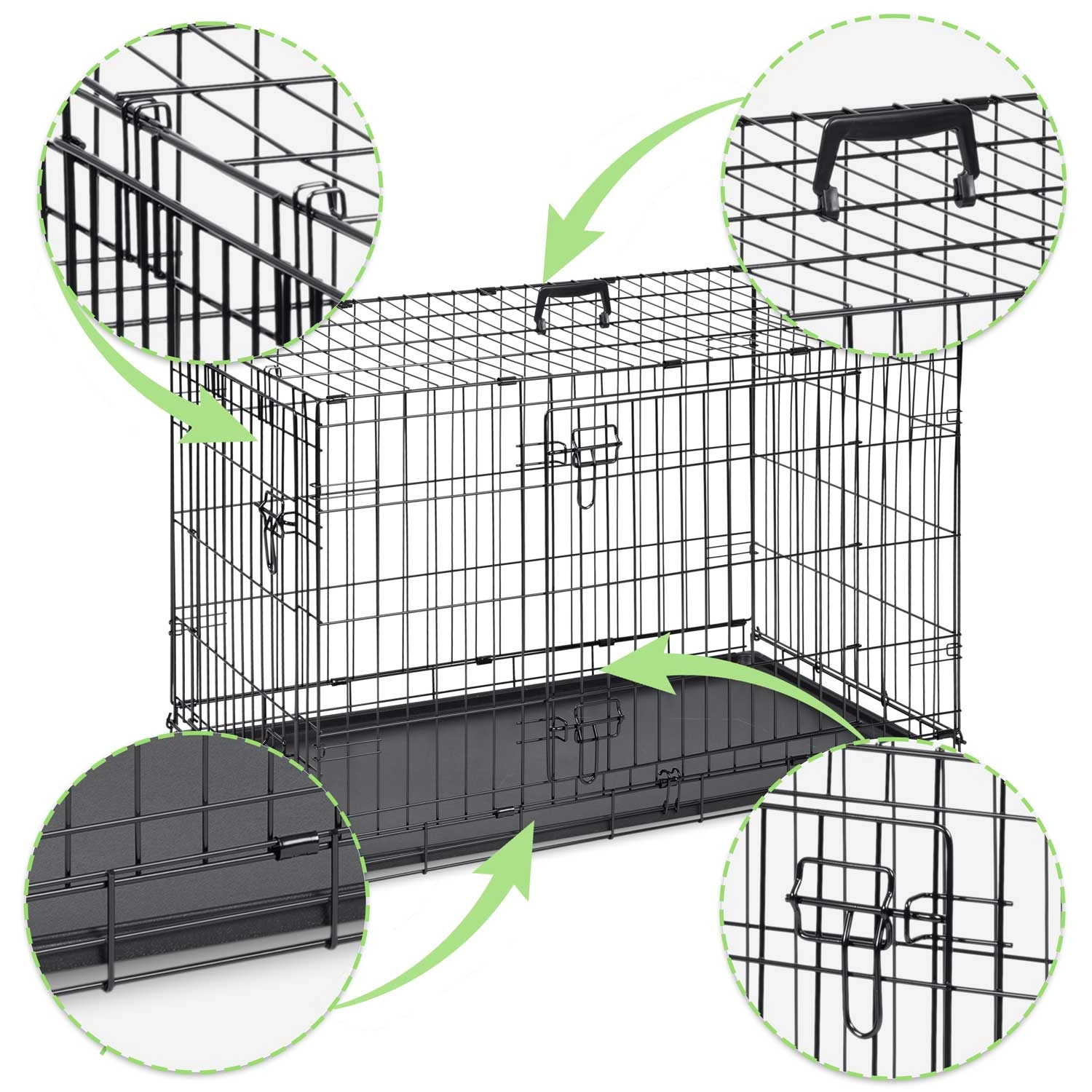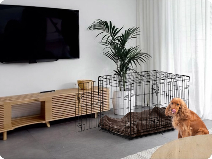 La structure en acier stable avec loquets de sécurité assure un repos serein et une fermeture fiable pendant le transport. La cage offre une excellente aération, permet au chien de voir ce qui l’entoure et l’aide à se sentir en sécurité, que ce soit à la maison, en excursion ou en voiture.