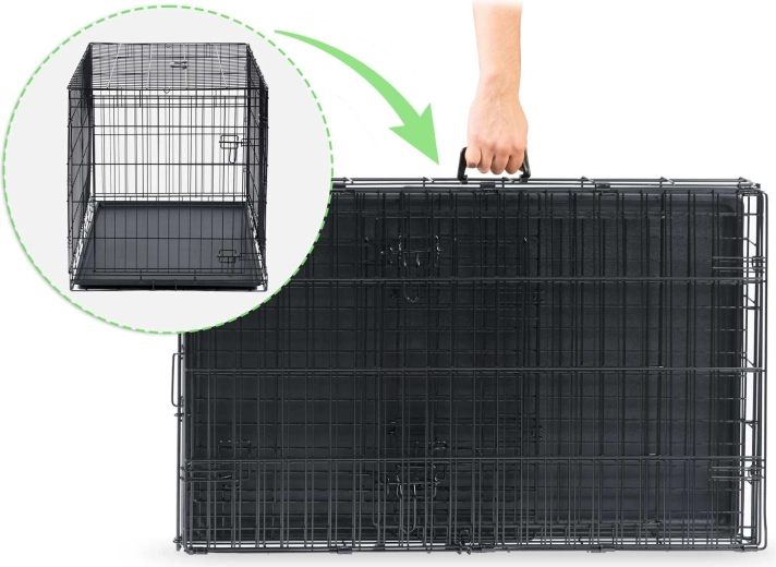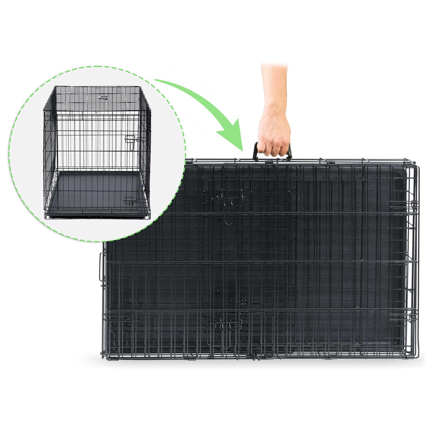 La structure pliante se transforme en format plat en quelques secondes. Grâce à la poignée, la cage se transporte, se range et se charge facilement dans le coffre.