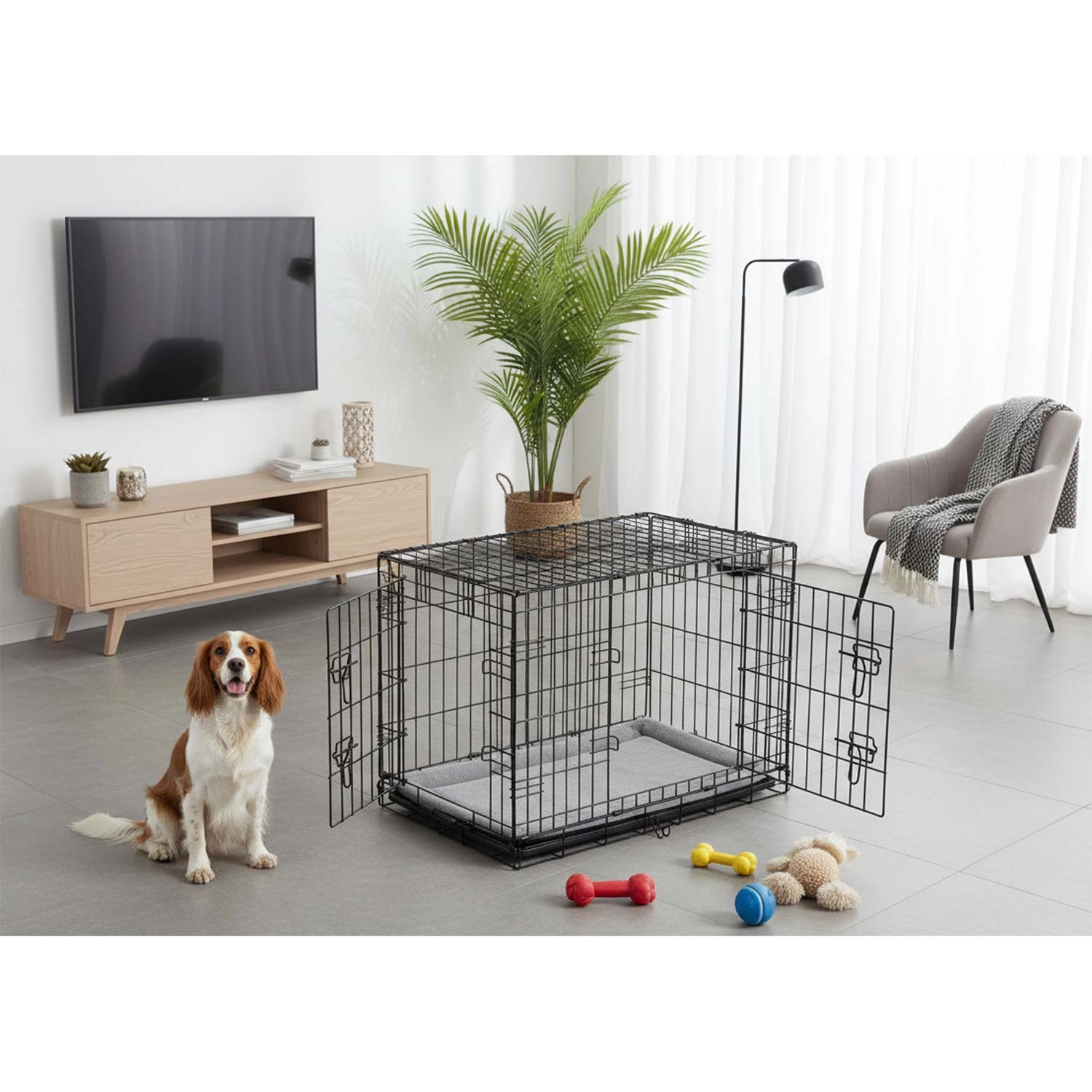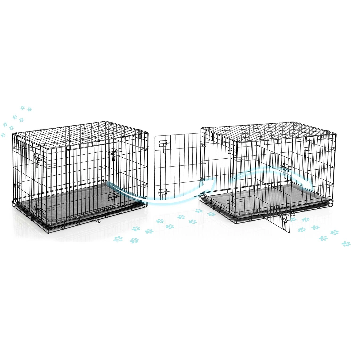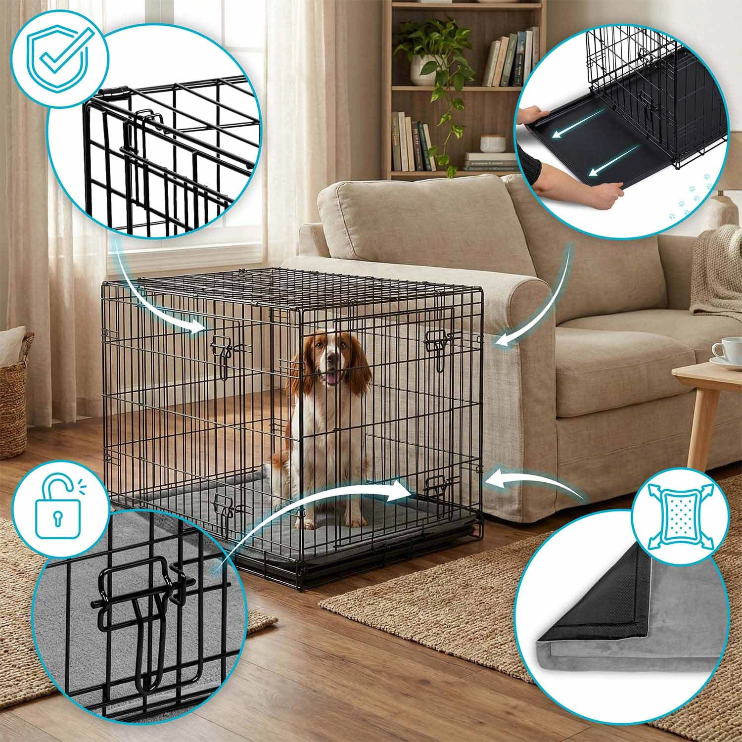 Les portes avant et latérale avec loquets de sécurité facilitent l’entrée du chien, simplifient le nettoyage et permettent une meilleure adaptation à votre intérieur.