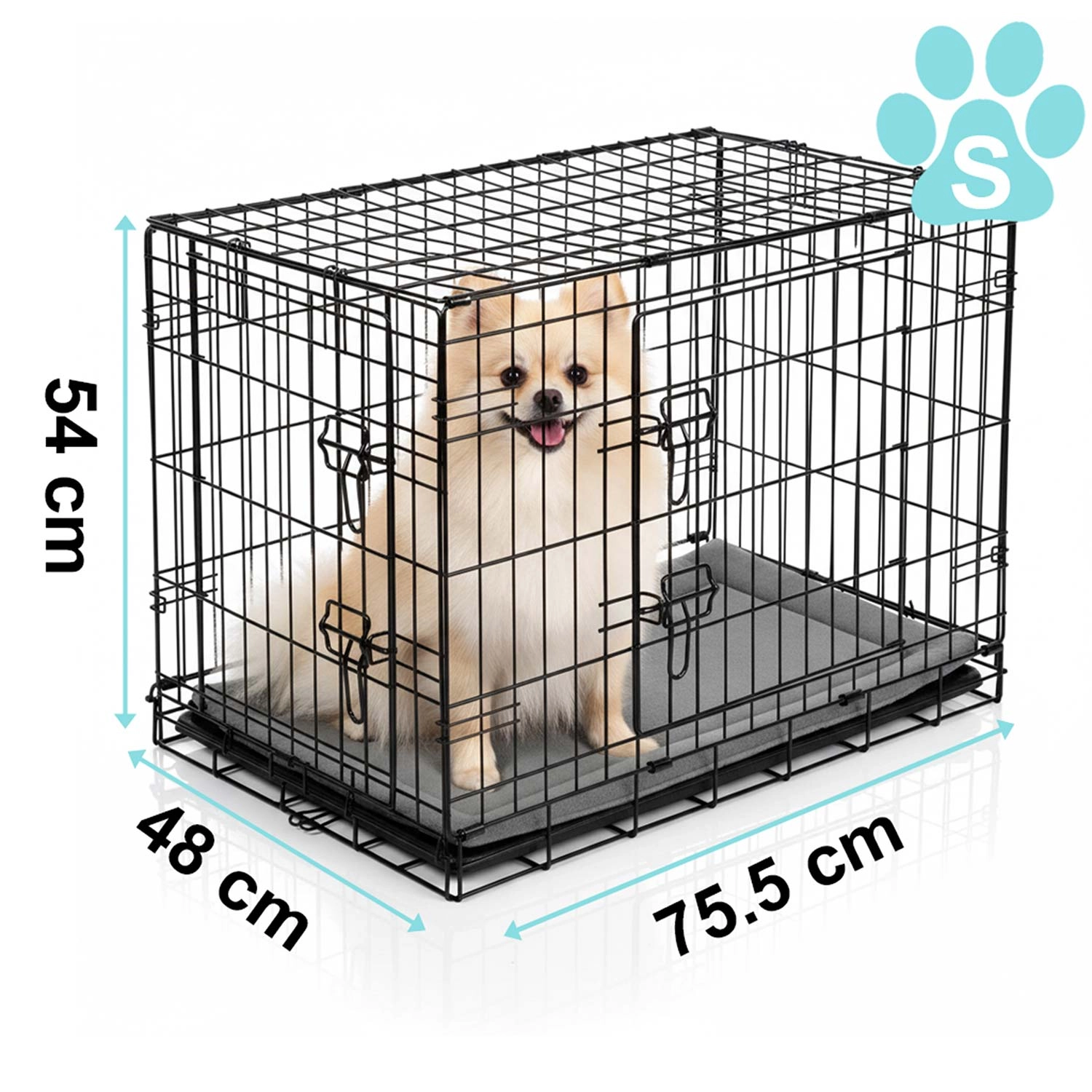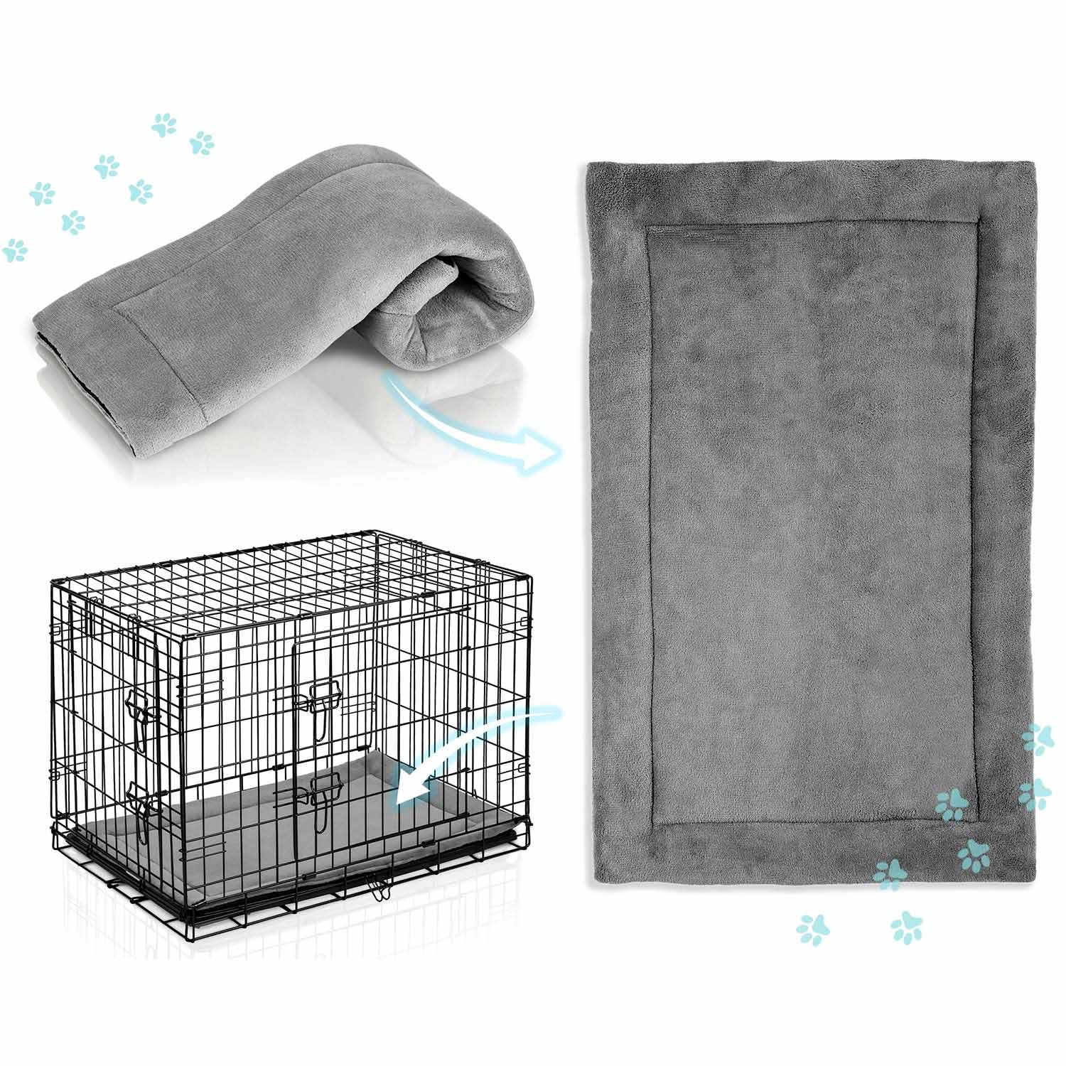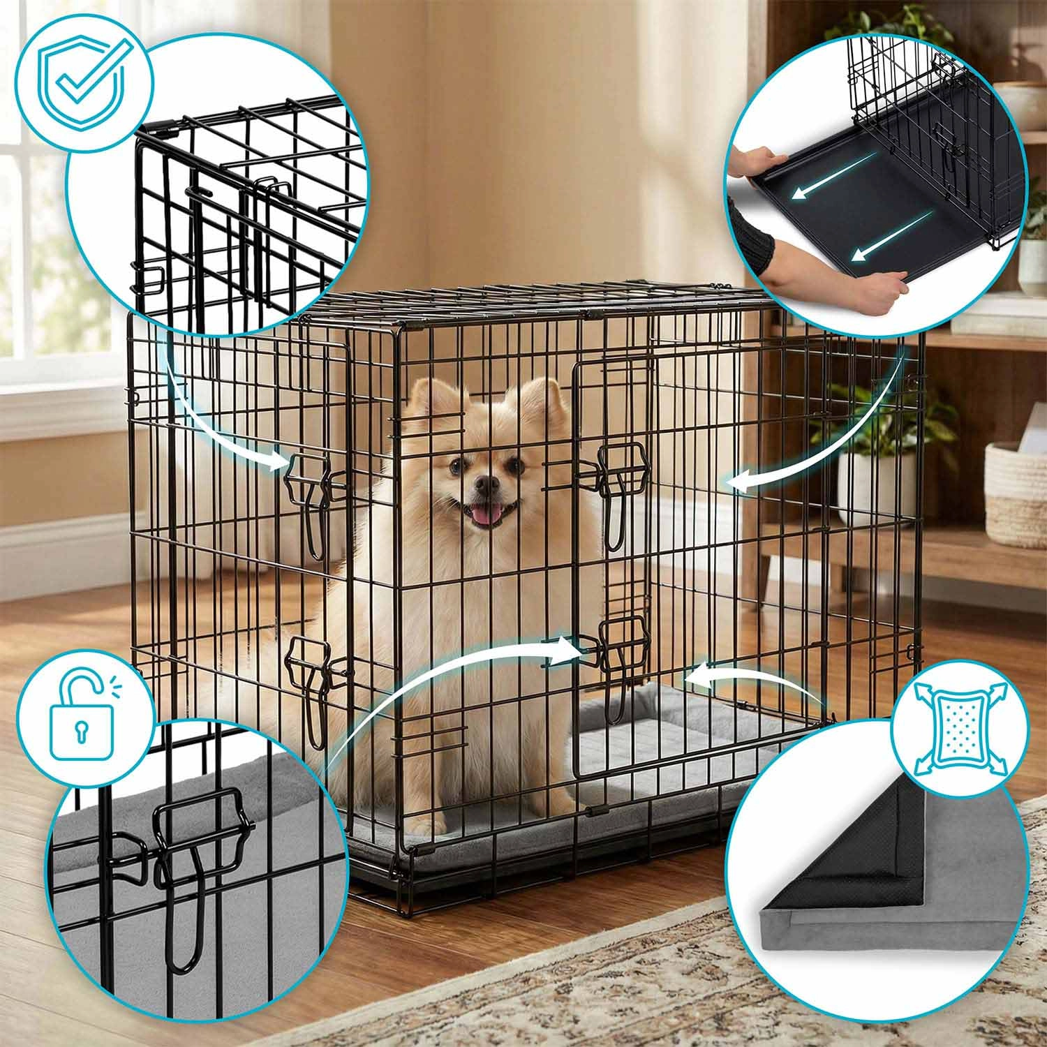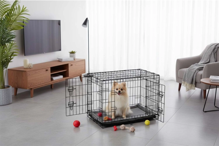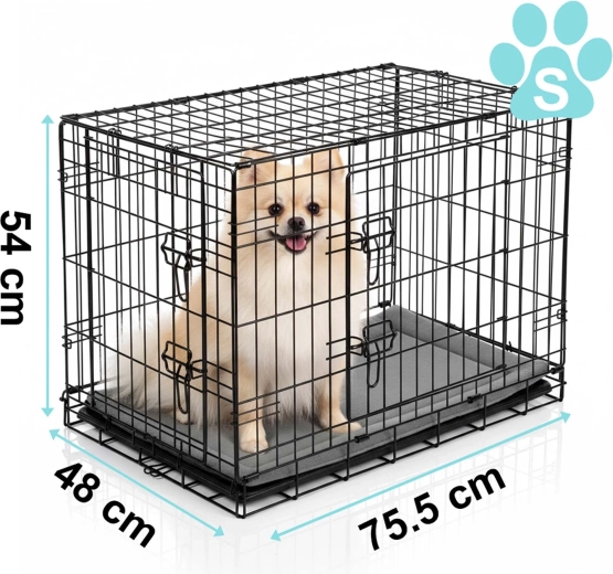 Caisse kennel pratique et résistante avec coussin pour petits chiens, offrant sécurité, confort et excellente ventilation à la maison comme en voyage. Deux portes pour un accès facile, plateau coulissant pour un nettoyage rapide et structure pliante à plat avec poignée de transport pour une utilisation aisée. Idéale pour l’entraînement, le repos et le transport sécurisé en voiture.