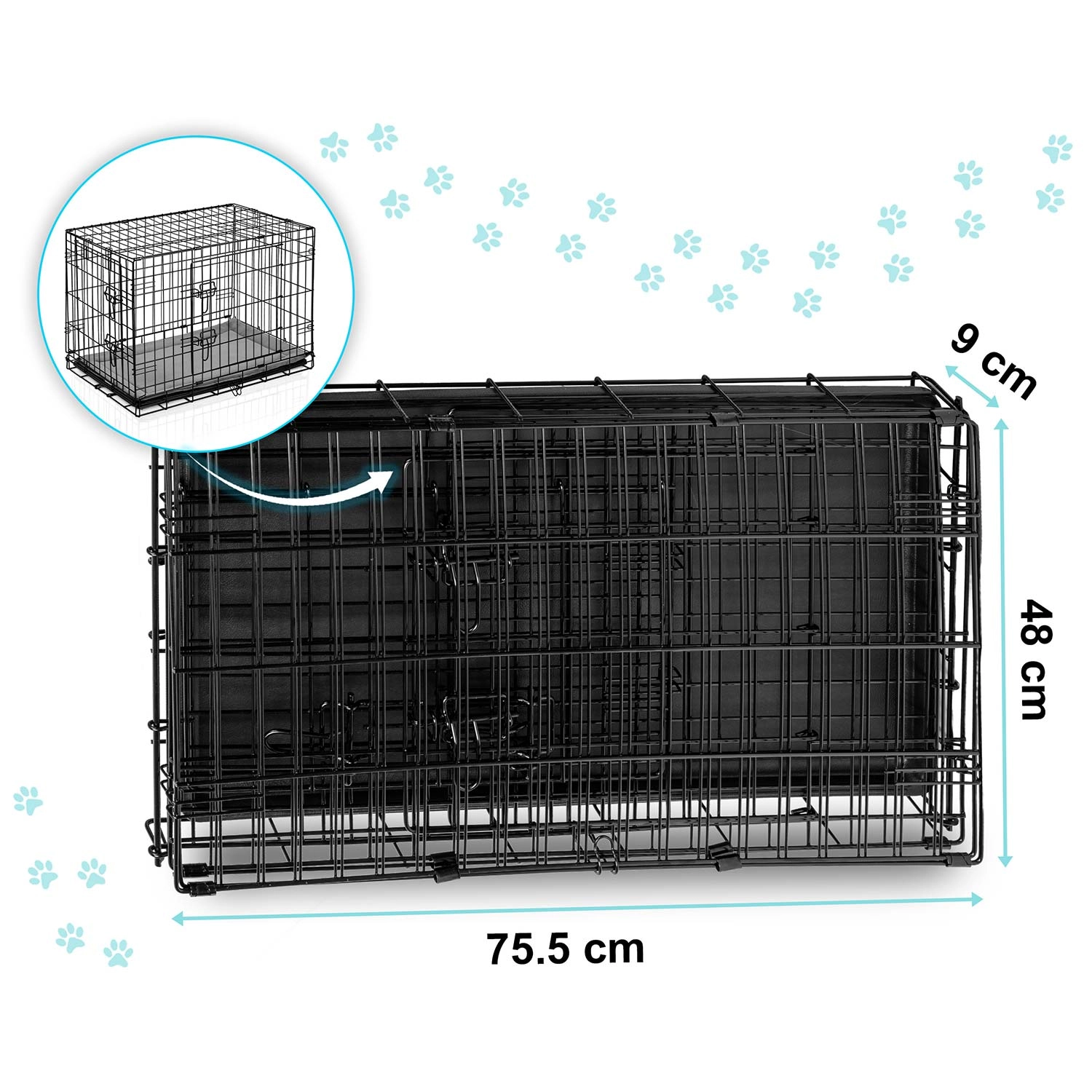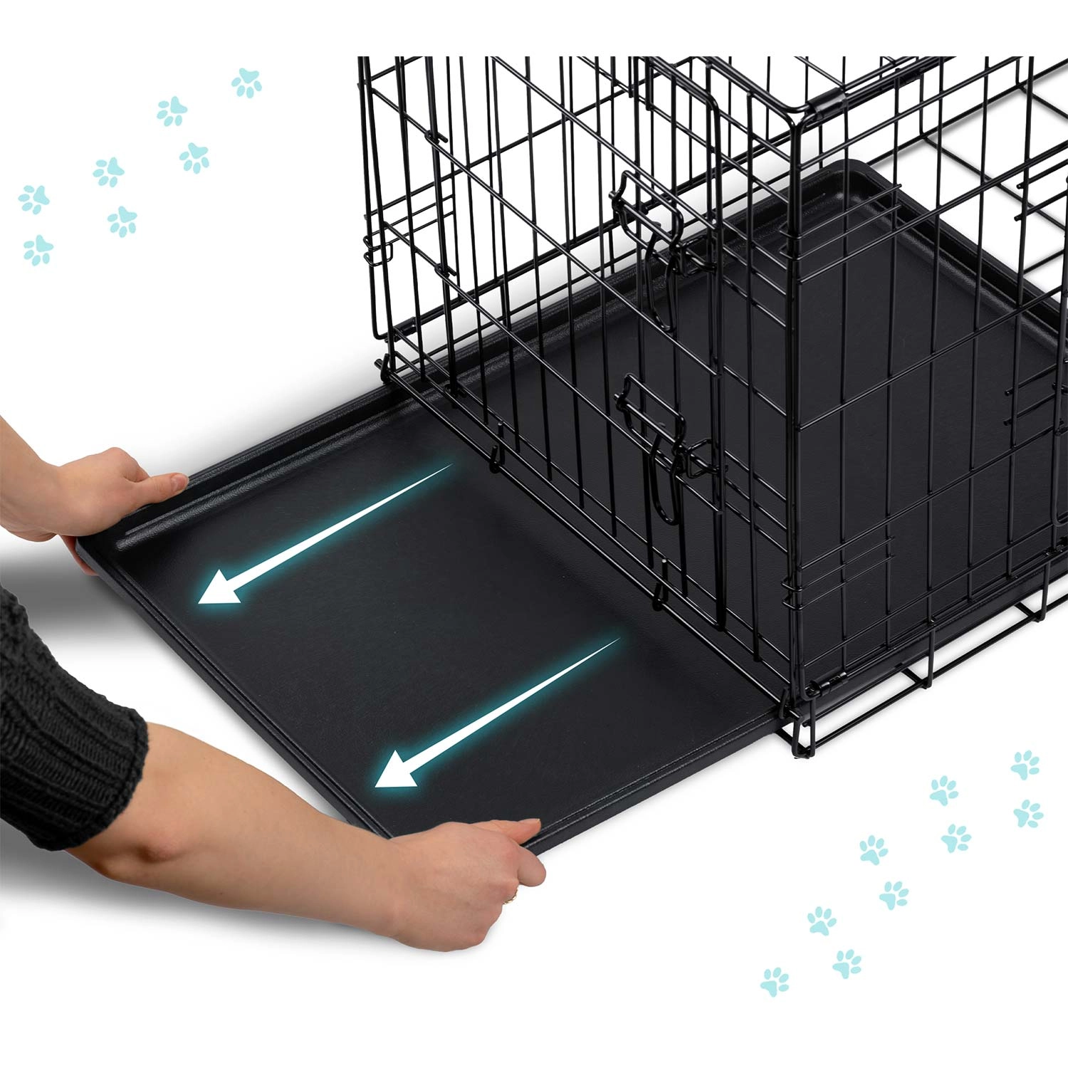 La caisse se plie en quelques secondes en un format “valisette” avec une poignée pratique. Le plateau en plastique amovible permet un nettoyage rapide et un maintien de l’hygiène à la maison comme en déplacement. La structure en treillis métallique garantit une circulation de l’air et une bonne visibilité, aidant à réduire le stress du chien.