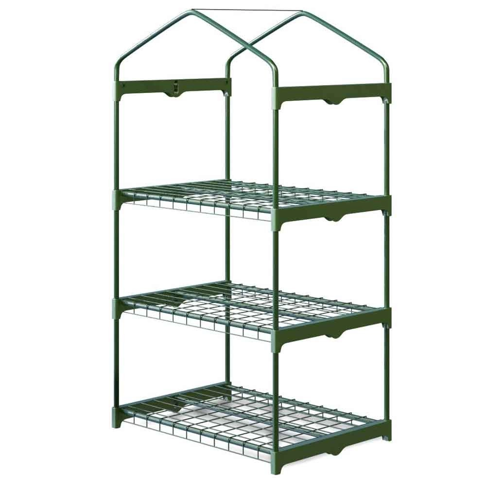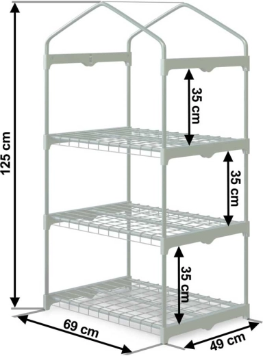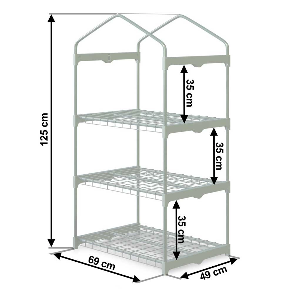 La configuration à trois niveaux avec un espacement des étagères de 35 cm économise de la place et accueille semis, herbes et petites jardinières.
