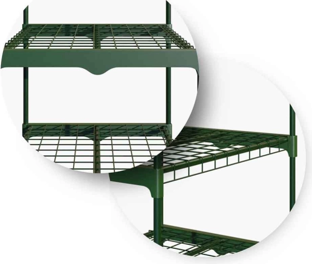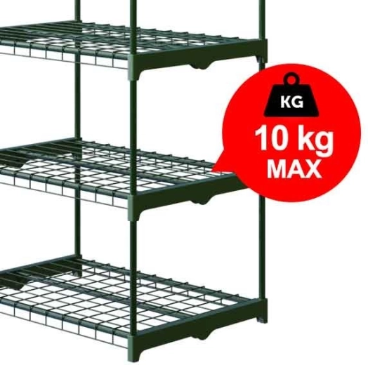 Le cadre en acier thermolaqué (Ø 16 mm) et les étagères en treillis métallique assurent résistance et stabilité même à pleine charge.