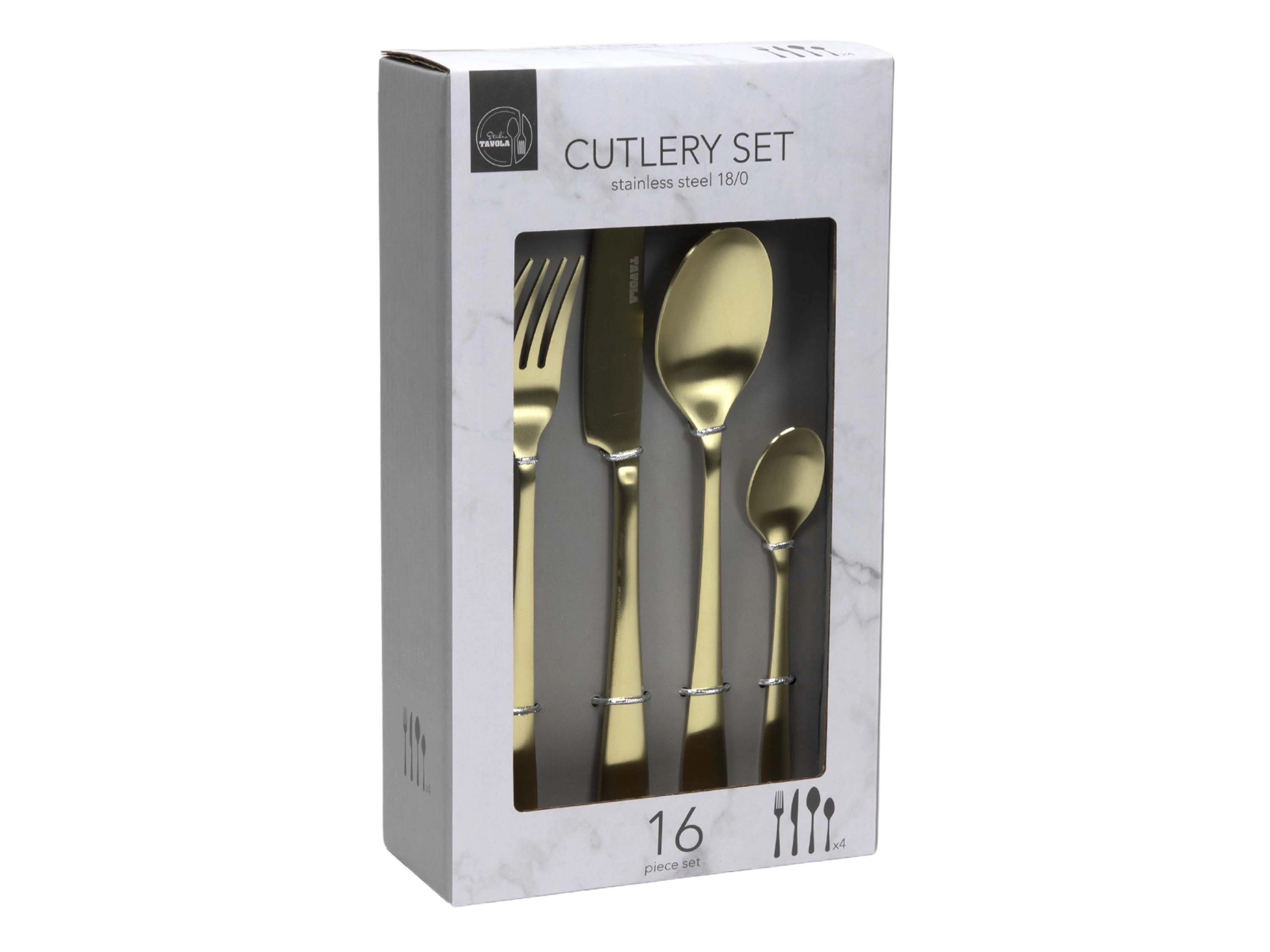 Élégant set de couverts au fini doré moderne, adapté au quotidien comme aux occasions festives. Il contient tout le nécessaire pour 4 personnes et séduit par son design intemporel et sa superbe finition dorée. Un choix idéal pour apporter à votre table une touche luxueuse tout en appréciant une utilisation pratique.