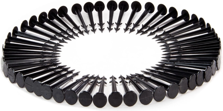 L’ensemble comprend 100 piquets en plastique avec pointes crochues et large tête pour une fixation rapide et stable de la toile, même sur surface irrégulière.