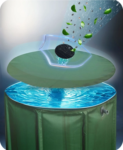 Le couvercle supérieur avec entrée pour les précipitations et tamis intégré retient feuilles et impuretés. L’eau reste limpide et prête à être utilisée immédiatement au jardin.