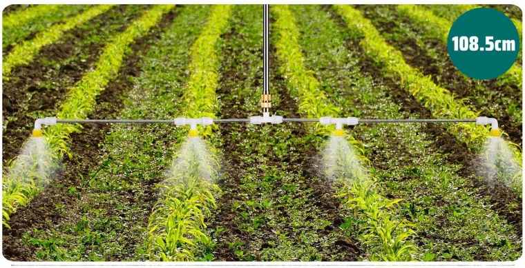 La lance à quatre buses permet une pulvérisation homogène sur une largeur allant jusqu’à environ 108,5 cm – idéale pour les grands massifs et les pelouses où vous avez besoin de rapidité et de régularité.
