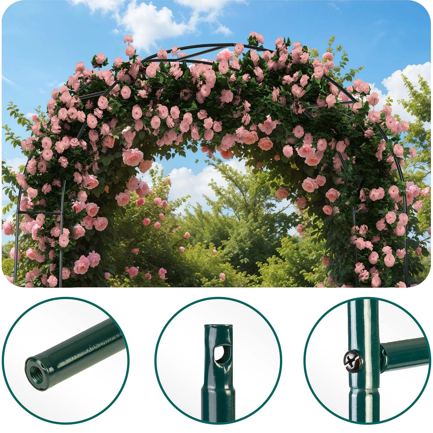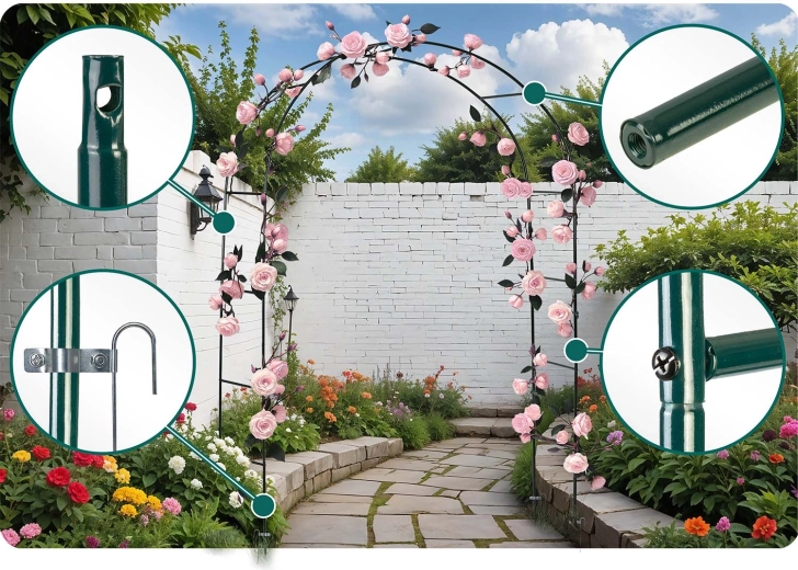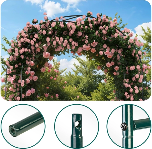 Cette pergola de jardin élégante deviendra un élément incontournable à l’entrée du jardin, le long d’une allée ou comme touche décorative près d’un kiosque. Sa forme arquée minimaliste et sa teinte vert foncé s’harmonisent naturellement avec les plantations et favorisent une croissance dense des plantes grimpantes, créant une ombre naturelle et une atmosphère chaleureuse.
