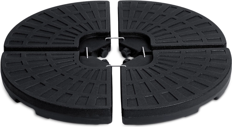 Le montage est rapide et intuitif : les quatre pièces entourent le mât du parasol et les crochets métalliques (inclus) les solidarisent fermement. La surface texturée améliore l’adhérence au sol et les orifices de remplissage permettent un remplissage et une vidange aisés. Solution idéale pour terrasses, jardins et terrasses de restaurant.