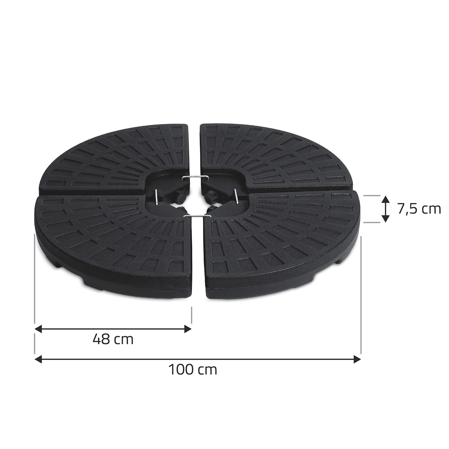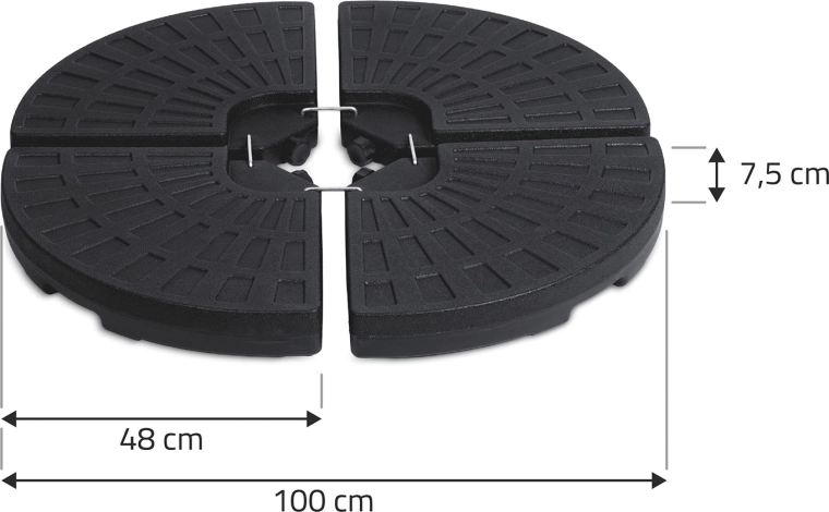 Cette base lestée en quatre parties est conçue pour l’ancrage sûr et durable des parasols de jardin et déportés. Chaque segment est fabriqué en HDPE robuste, résistant à l’usure mécanique et aux intempéries. La base se remplit de sable ou d’eau : elle reste légère lors du transport et offre une stabilité maximale une fois installée.