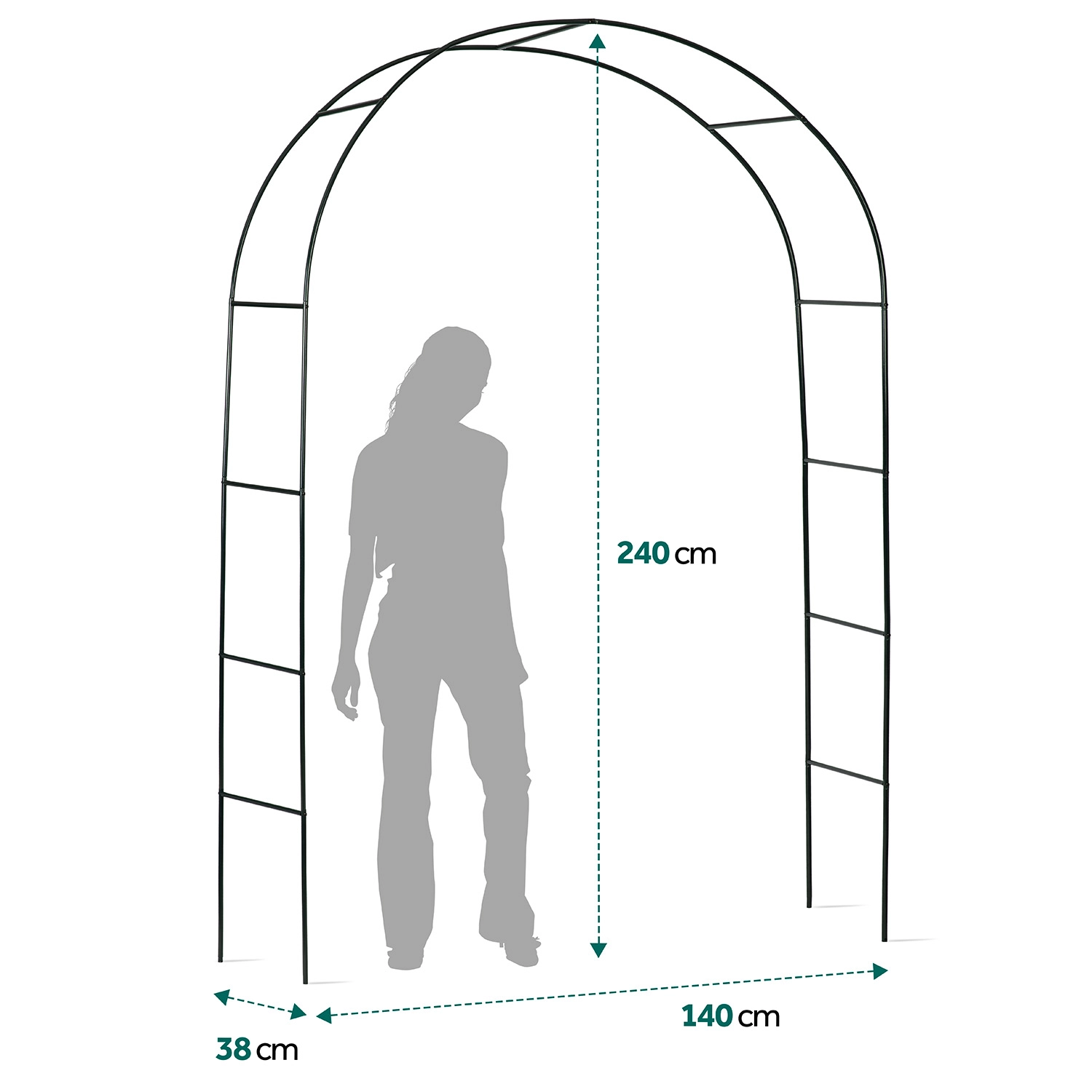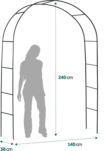 Élégante pergola de jardin en arche de 240 cm de hauteur, elle offre à votre jardin une entrée romantique et un support pour les plantes grimpantes. Elle possède une structure en acier résistante avec revêtement par poudre, un montage facile sans outillage spécialisé et des ancrages pour une fixation stable dans le sol. Idéale pour les rosiers, le lierre, la vigne ainsi que pour les décorations avec des guirlandes lumineuses.