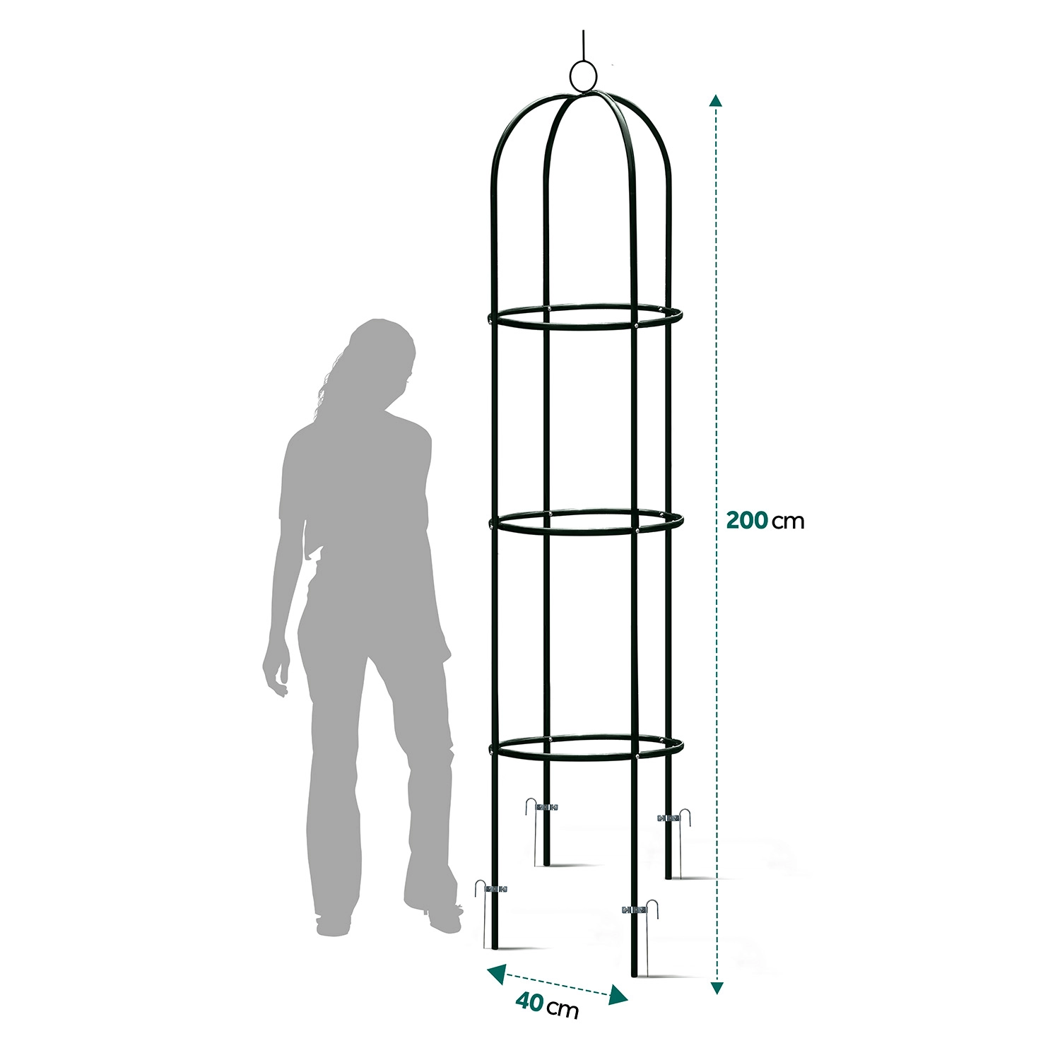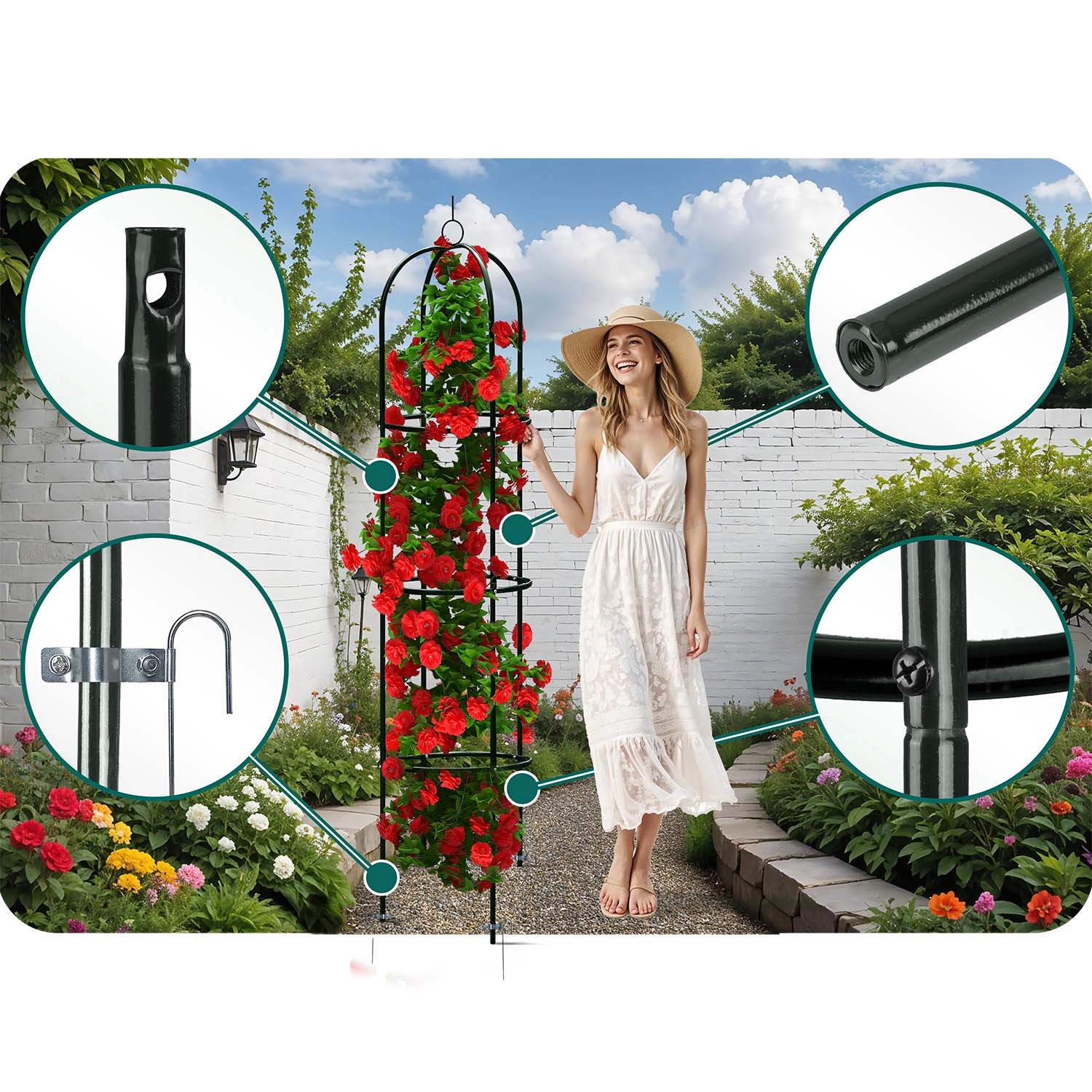 Le montage est rapide et intuitif – les éléments s’emboîtent avec précision et les vis nécessaires sont incluses. Le jeu de quatre ancres de sol maintient la structure fermement en terre, permettant à vos plantes de pousser en toute sécurité et bien droites. Créez une entrée romantique, un accent vertical dans un massif ou une décoration spectaculaire en pot.