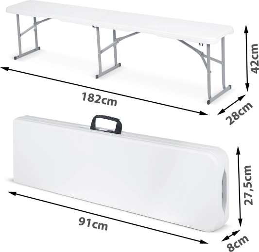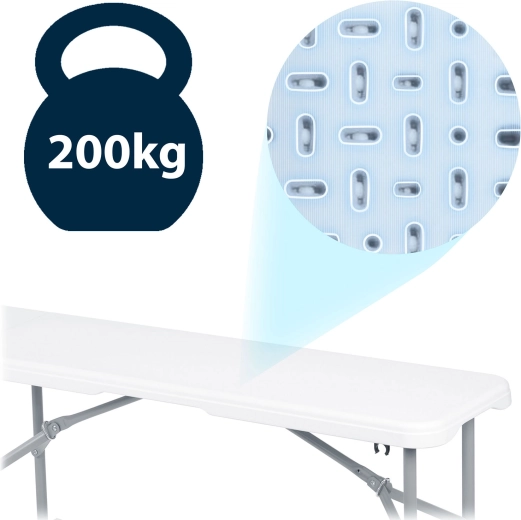 Pratique, le banc pliant de 180 cm est idéal pour le jardin, les fêtes et le camping. Il dispose d’une structure en acier stable, d’une surface imperméable et facile à nettoyer et d’une poignée de transport confortable. Grâce à ses dimensions compactes une fois plié, il se range et se transporte facilement, tout en offrant une capacité de charge jusqu’à 200 kg et une excellente stabilité.