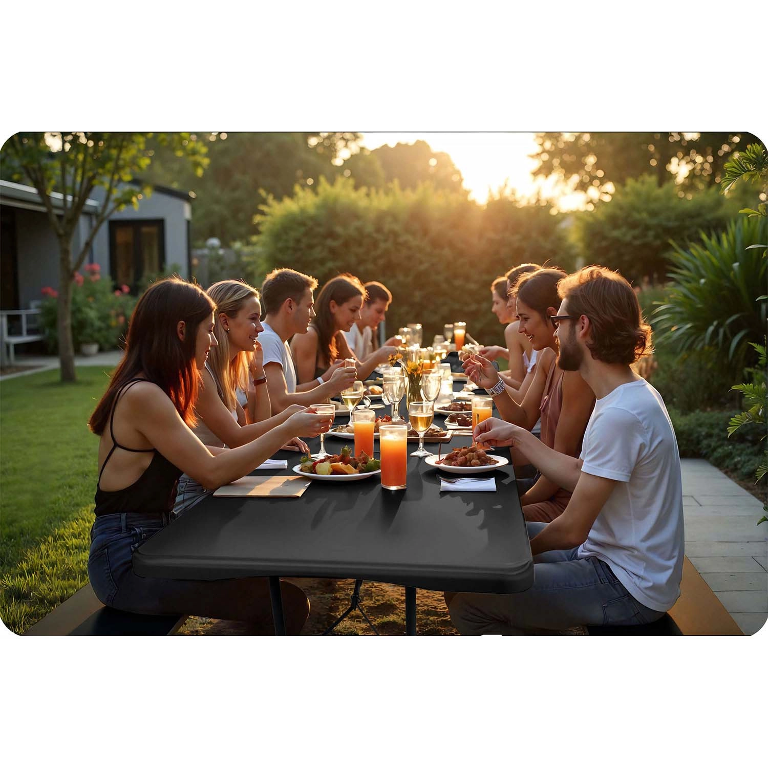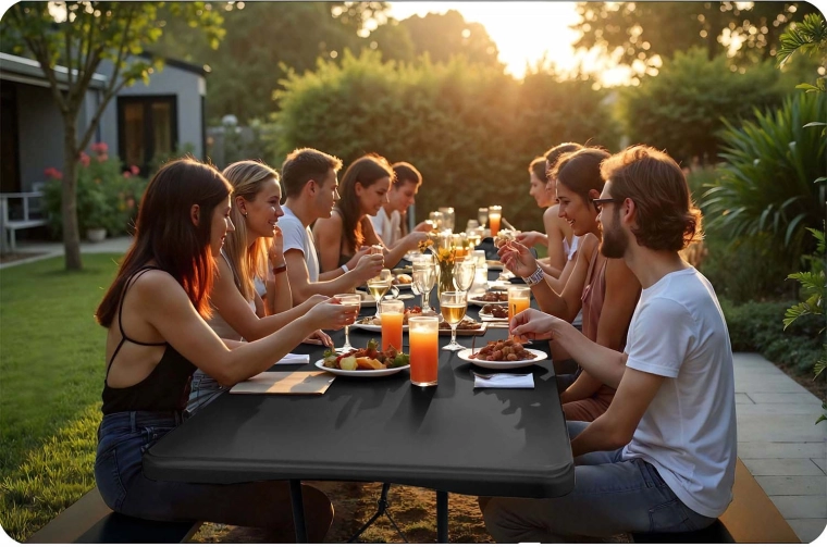 - PE imperméable, facile à nettoyer – idéal pour le jardin, la terrasse et le catering.