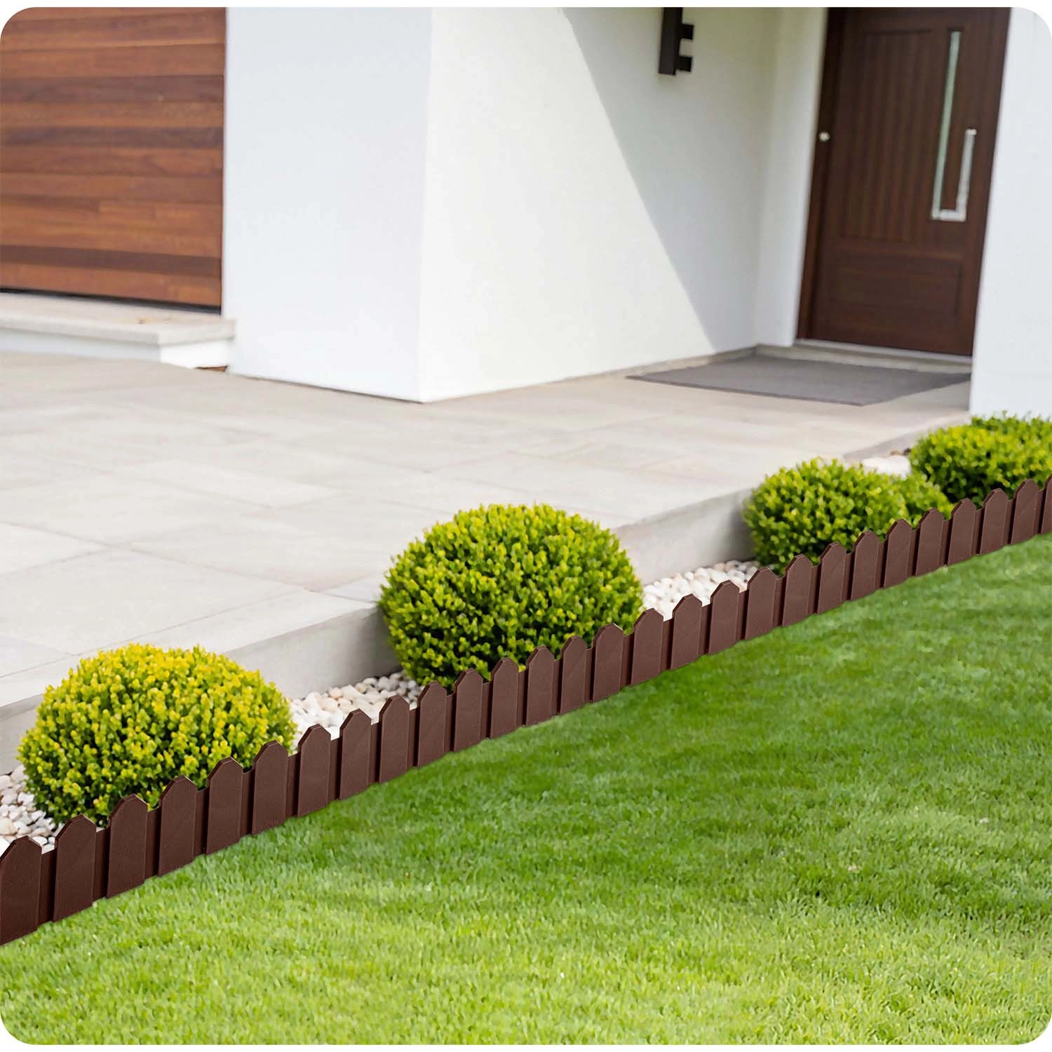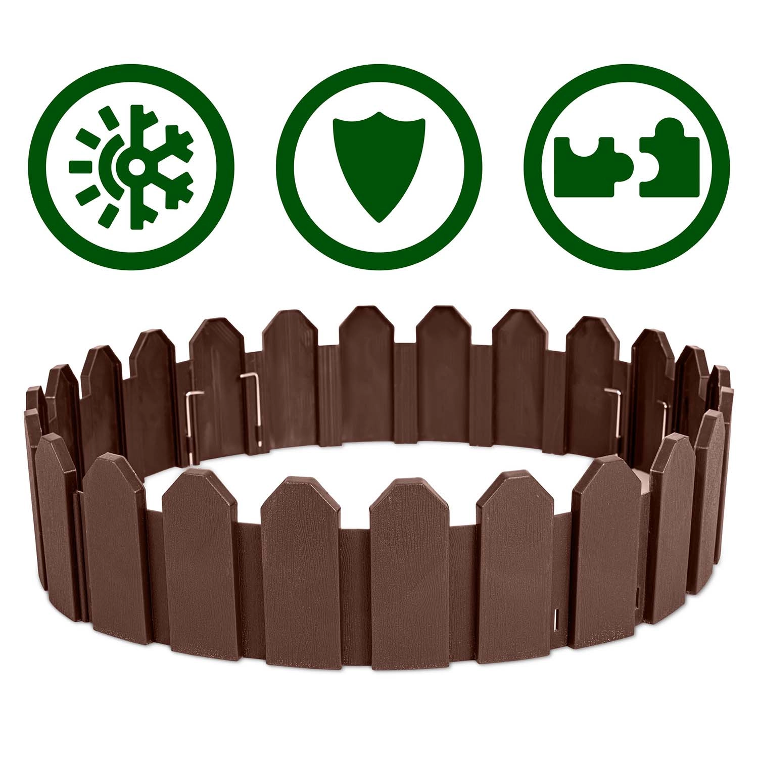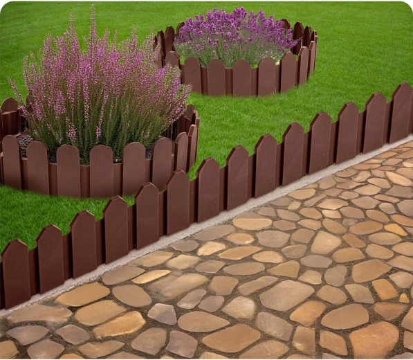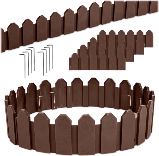 Le matériau PP durable avec protection UV et résistance au gel garantit une longue durée de vie sans décoloration ni fissuration. Les ancrages en acier (8 pièces incluses) permettent une fixation solide dans le sol, de sorte que la bordure conserve sa forme et empêche la dispersion de l’écorce ou des cailloux sur la pelouse.
