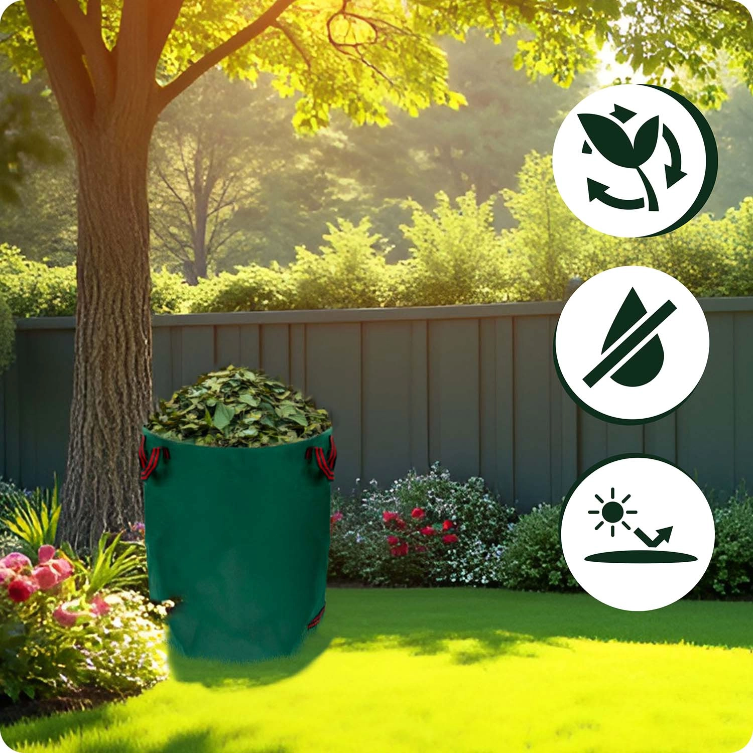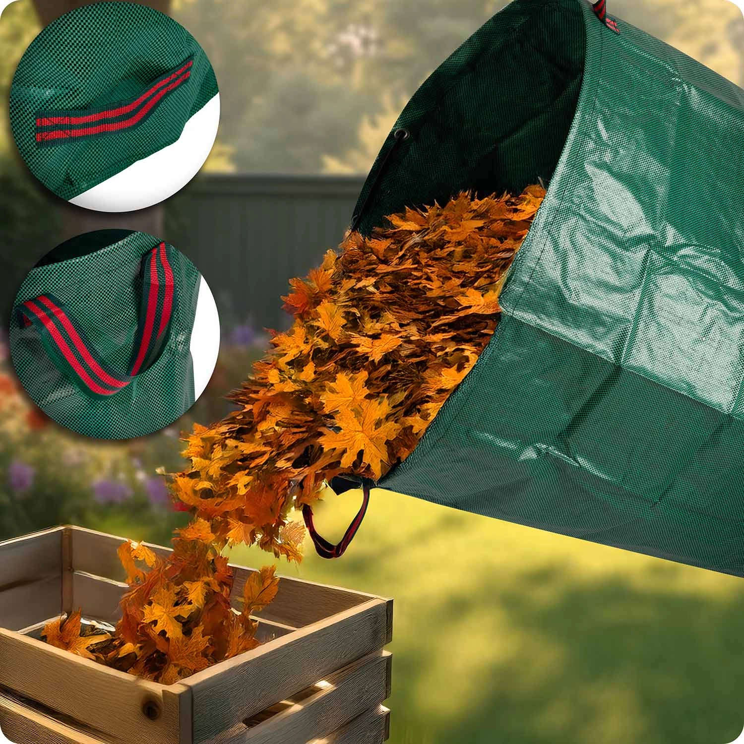 Le matériau PP de 150 g/m² est solide, résistant aux déchirures et supporte durablement les conditions extérieures – ne décolore pas au soleil et ne perd pas son élasticité par temps froid. Les 4 anses pratiques (2 supérieures pour porter et 2 inférieures pour basculer) facilitent le levage comme la vidange du contenu.