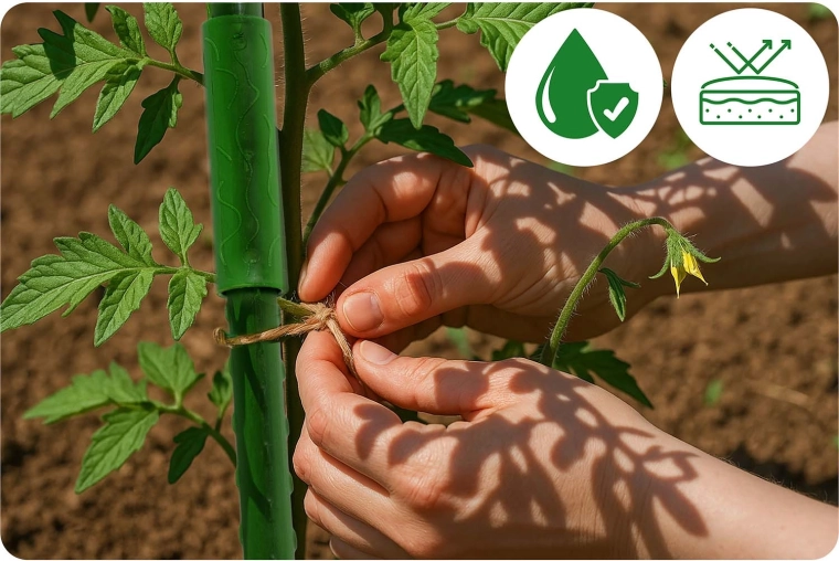 Le système modulaire fait gagner de l’argent et de la place : reliez simplement vos tiges existantes, puis démontez-les rapidement après la saison pour les stocker. La dimension universelle convient à la plupart des tiges courantes de 11 mm de diamètre – en bambou, en acier, avec âme ou en plastique.