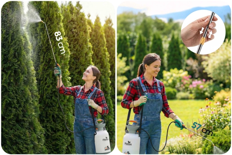 Le pulvérisateur offre une diffusion contrôlée et uniforme avec une pression jusqu’à 2,76 bar et une régulation continue du débit – de la fine brume au jet puissant. La lance télescopique de 57–83 cm vous permet d’atteindre aisément les arbustes et les zones difficiles d’accès sans vous courber inutilement. Un excellent choix pour l’arrosage, l’application d’engrais et la protection des plantes contre les ravageurs.