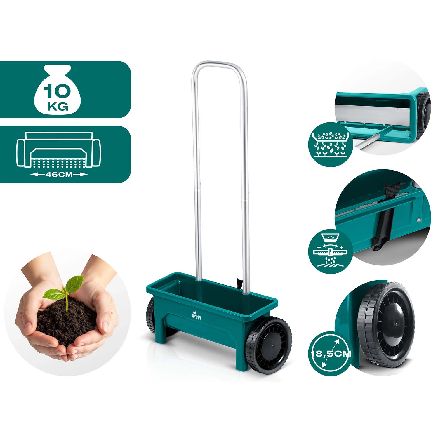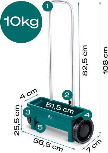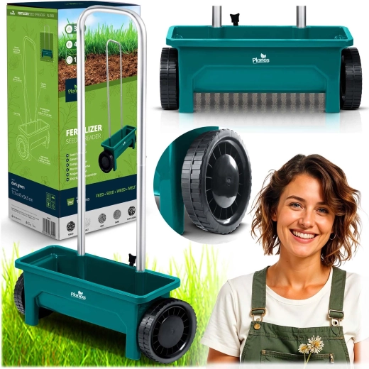 La trémie en plastique résistant est facile à nettoyer et les grandes roues assurent une progression fluide même sur terrain irrégulier. La poignée ergonomique réduit la fatigue lors des travaux prolongés, et l’entraînement manuel garantit une mise en œuvre simple et immédiate sans entretien complexe.