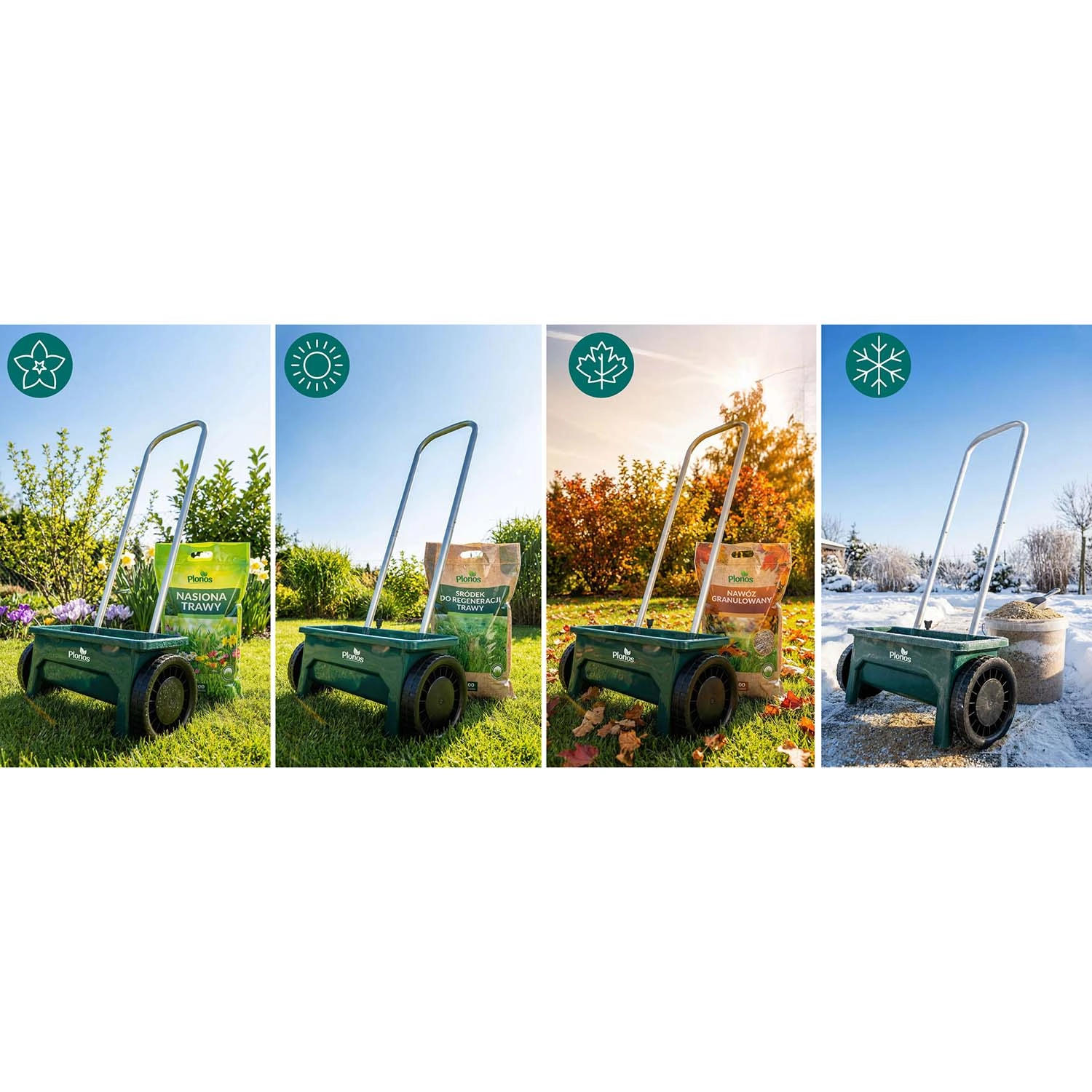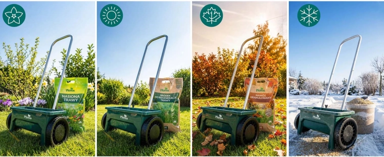 Semis et fertilisation en saison, en hiver sel et sable pour trottoirs et allées. Un seul outil pour toute l’année.