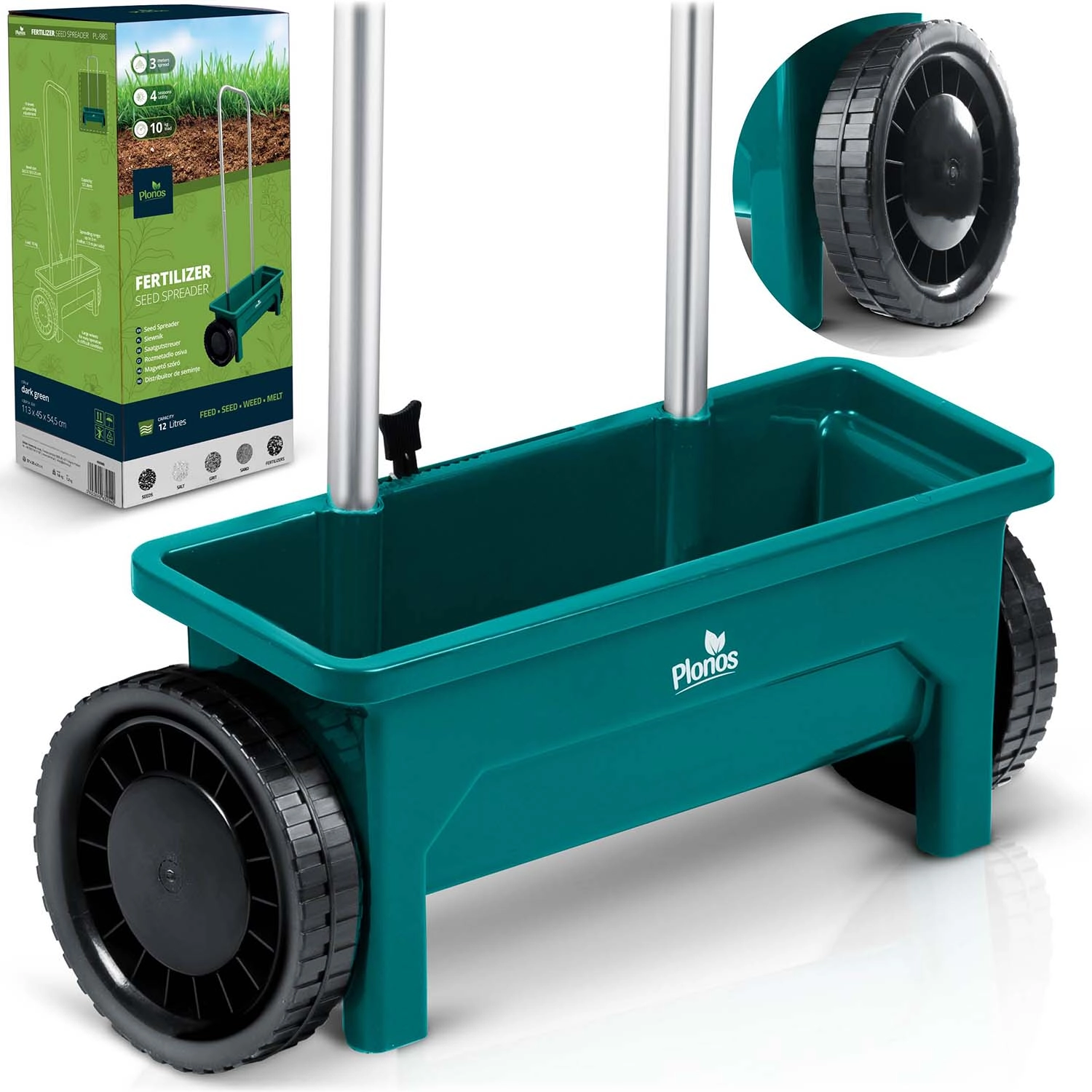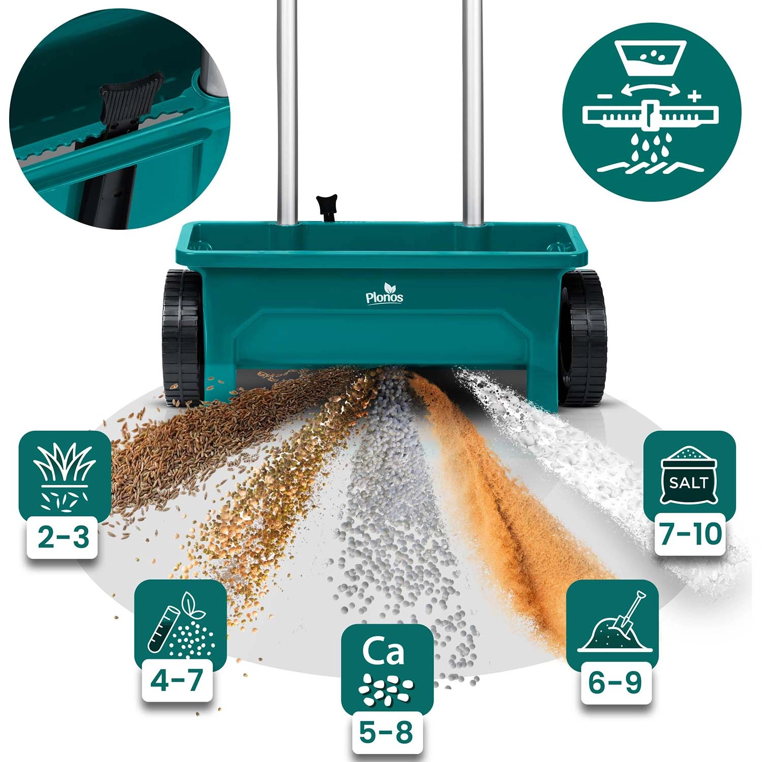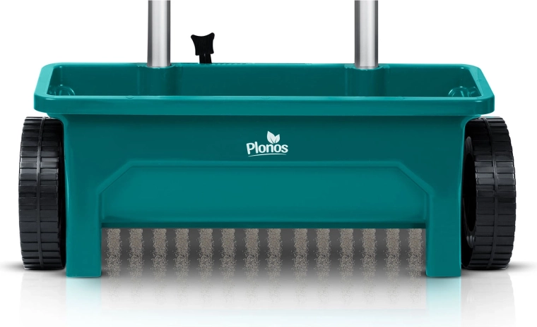 L’épandeur PLONOS 12 l est un auxiliaire fiable pour l’entretien de la pelouse et des trottoirs. Du printemps à l’hiver, il dose facilement graines de gazon, engrais, granulés, sable et sel de déneigement. Le débit réglable en 10 paliers permet d’adapter précisément la quantité et la taille du matériau épandu pour un recouvrement homogène des surfaces.