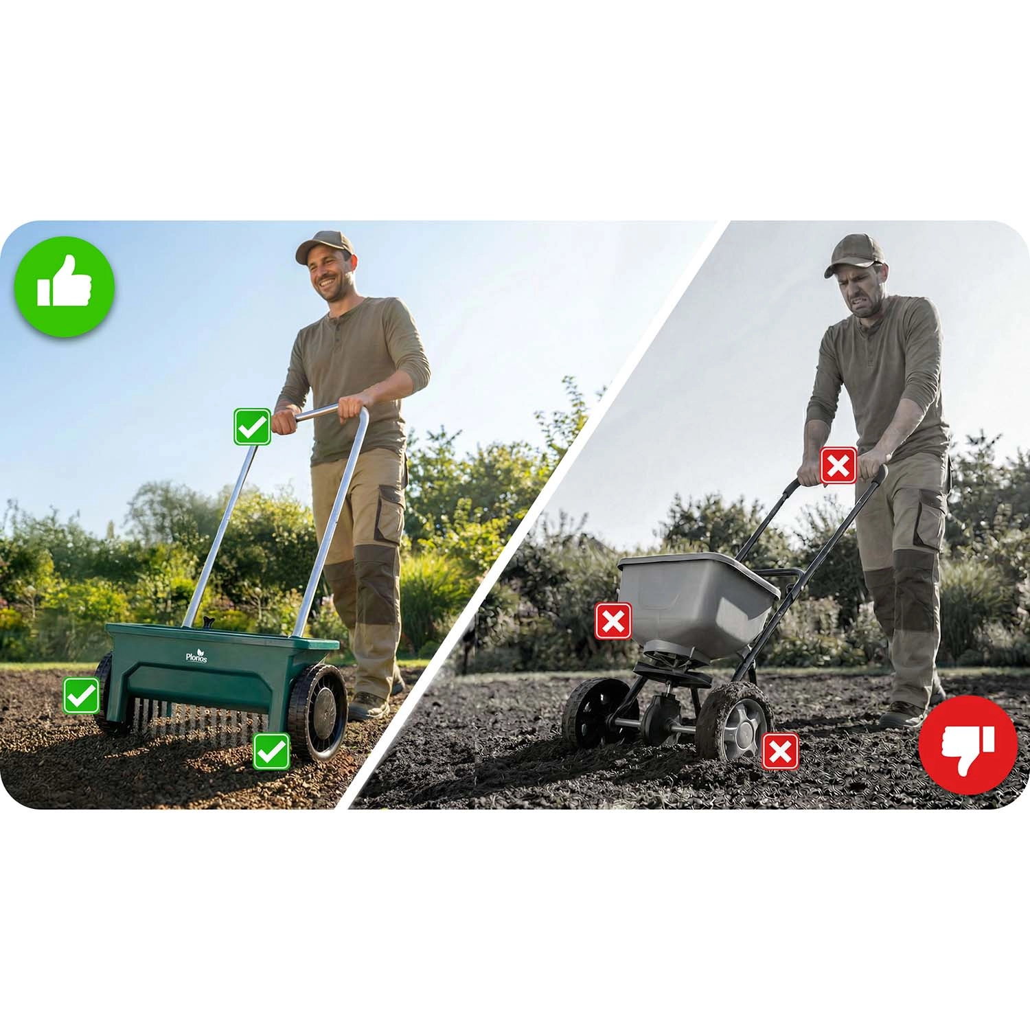 Stabilité et maniabilité aisée sur pelouse comme sur surfaces dures. L’épandeur garde sa trajectoire et la diffusion reste constante.