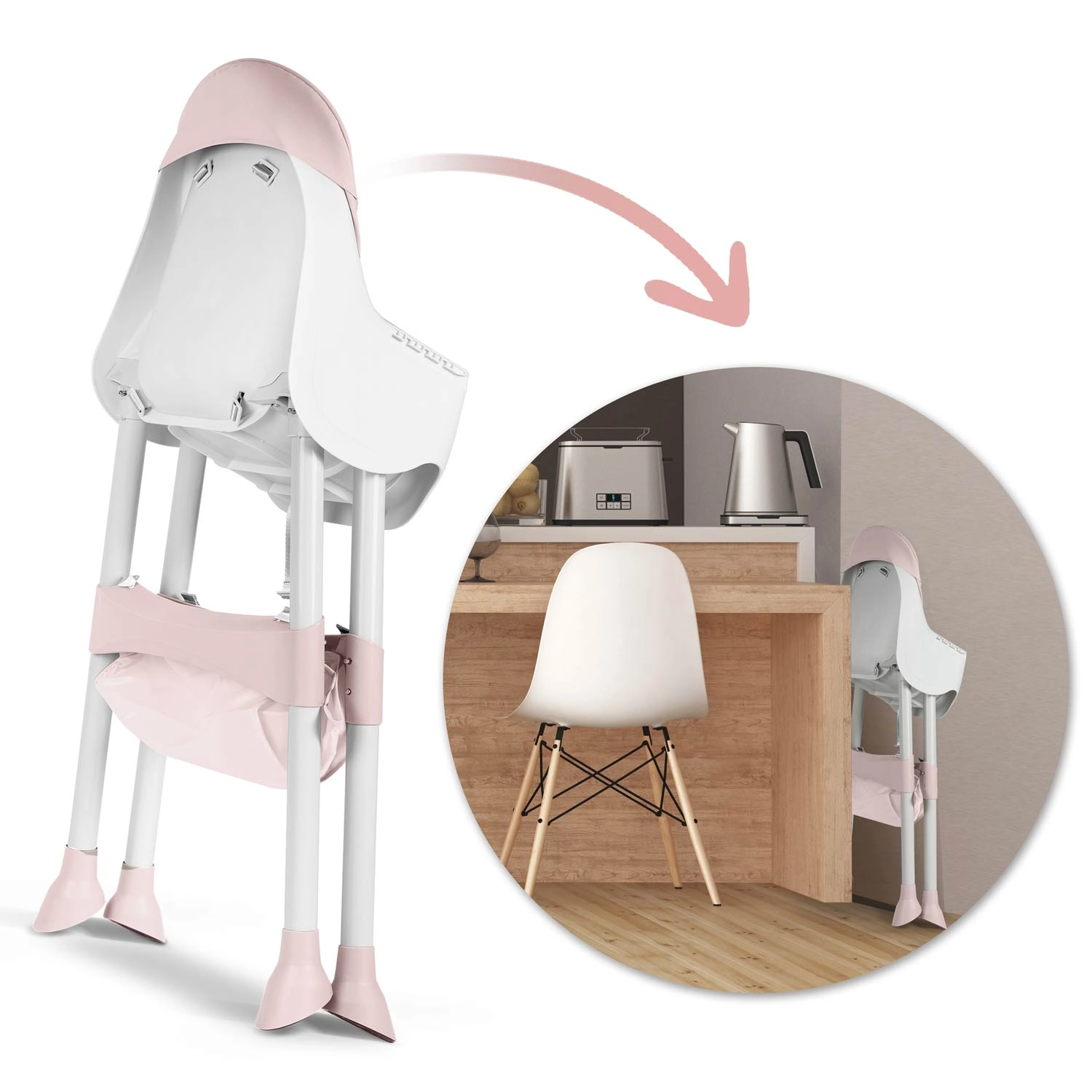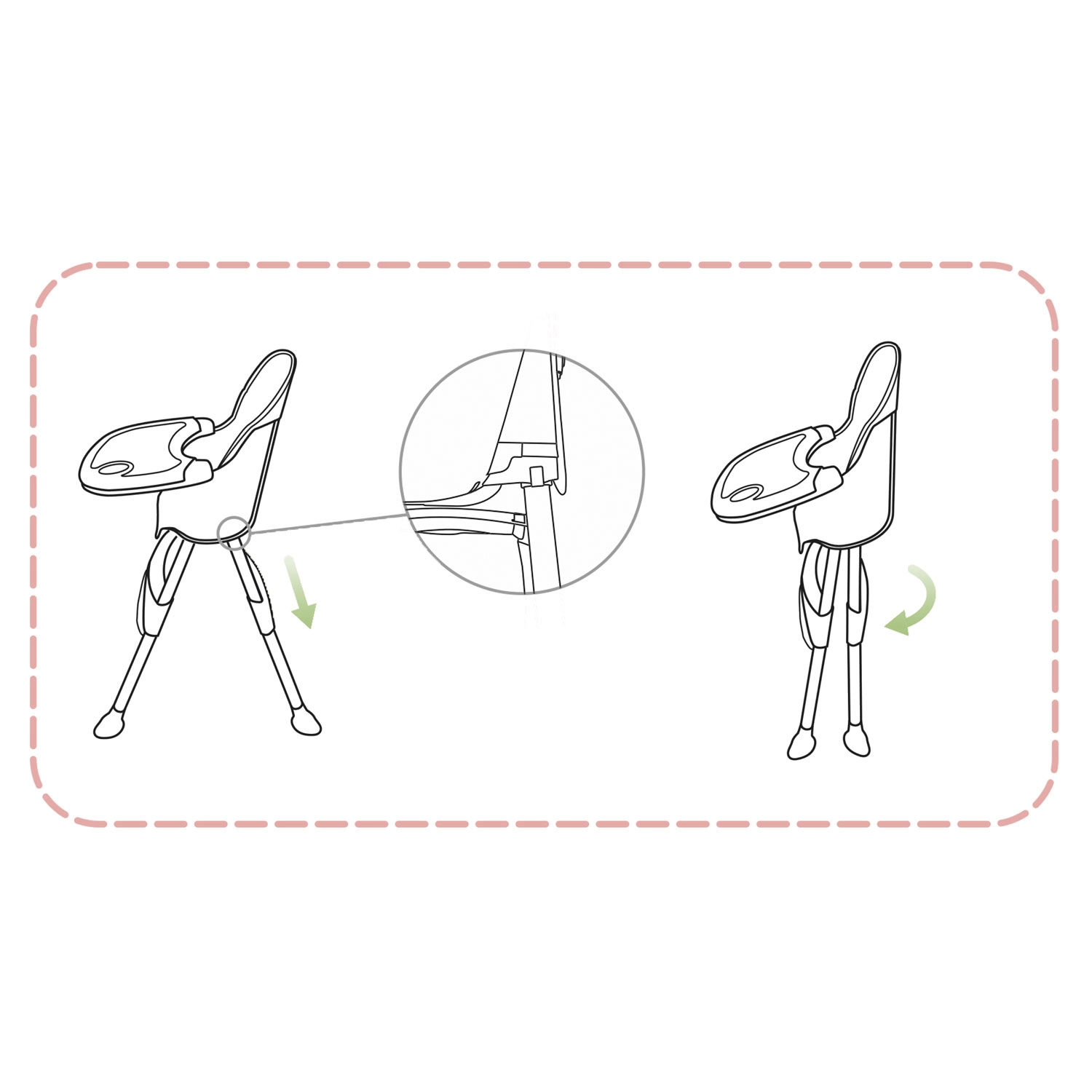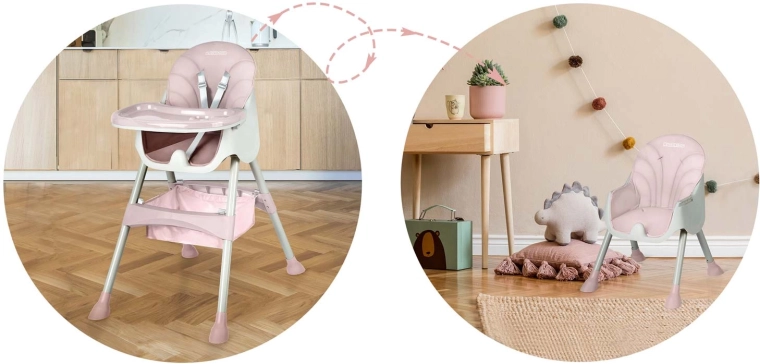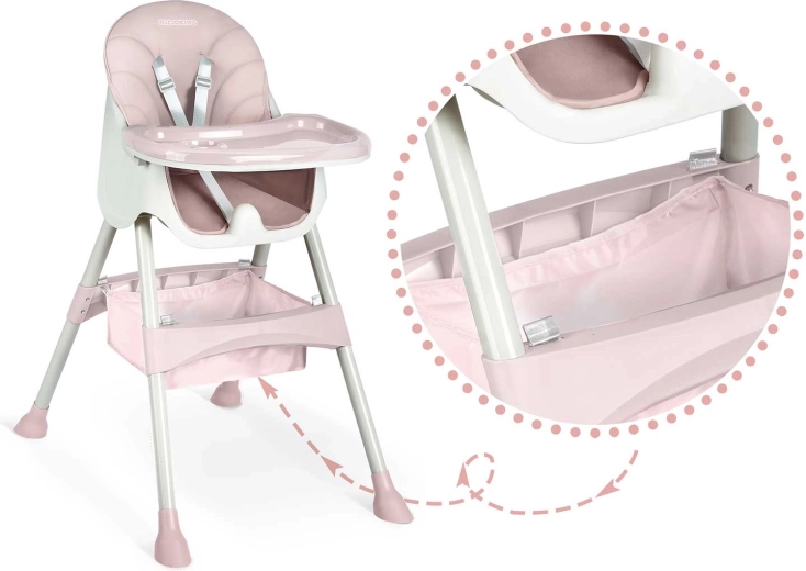 La chaise se plie facilement en un format compact, sans encombrer même dans les petits appartements. Trois réglages de distance de la tablette offrent une position idéale pour les différentes étapes d’âge. Le panier pratique sous l’assise accueille lingettes, jouets et bavoirs pour tout avoir à portée de main.