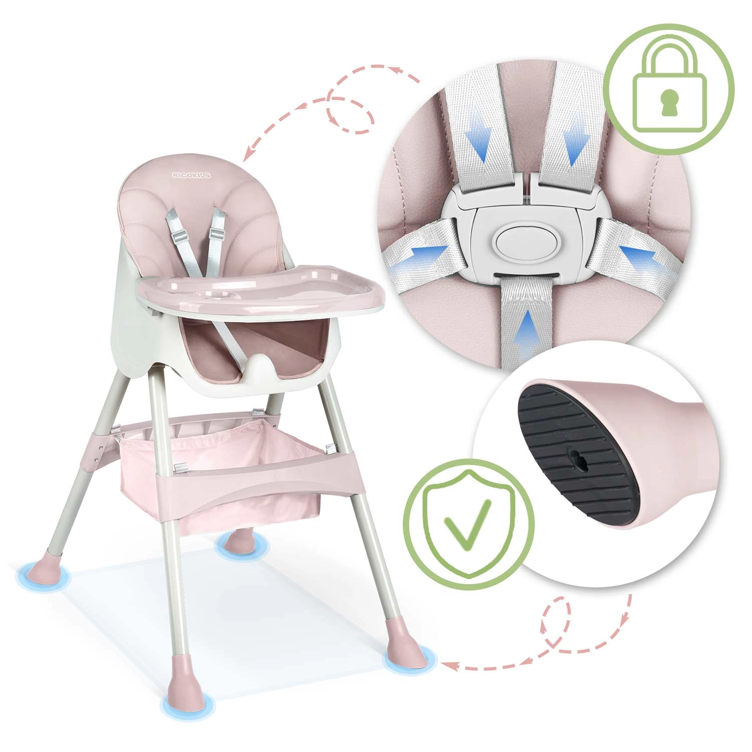 Le harnais 5 points, les pieds antidérapants et une base robuste garantissent une assise stable et sûre pendant les repas comme les jeux.