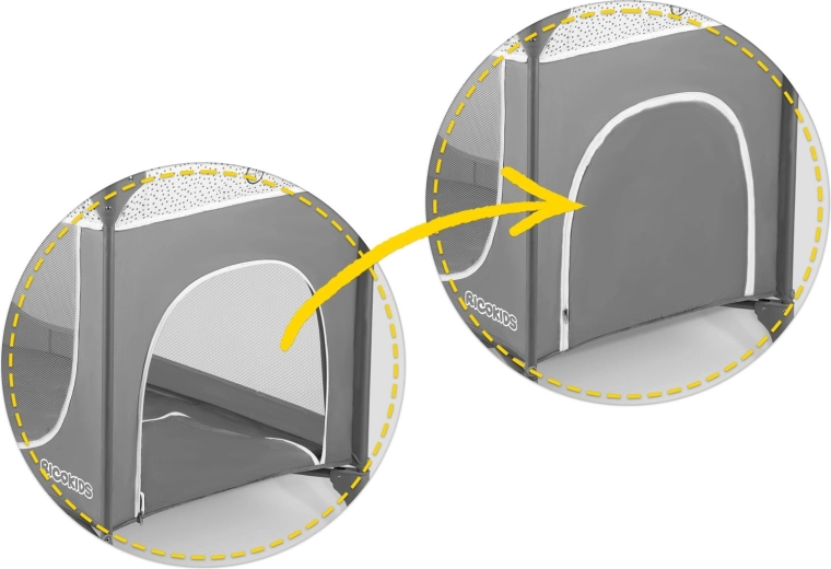 L’ouverture latérale zippée facilite la sortie autonome des enfants plus grands. Les parois en maille assurent une bonne circulation de l’air et une visibilité constante.
