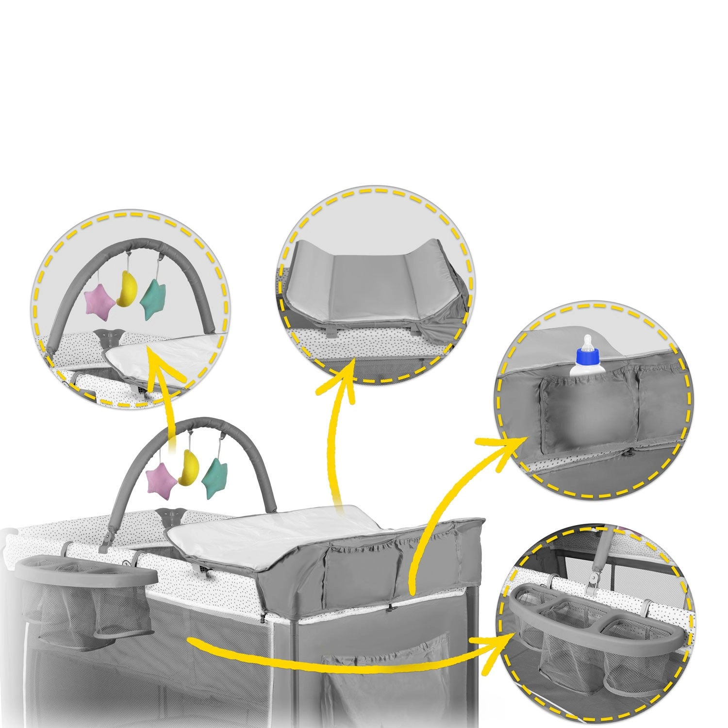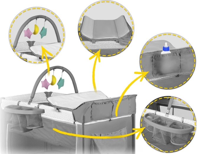 • Accessoires complets – table à langer, jouets, poches, sac et matelas inclus.