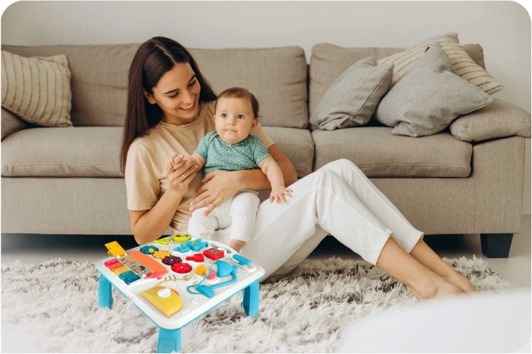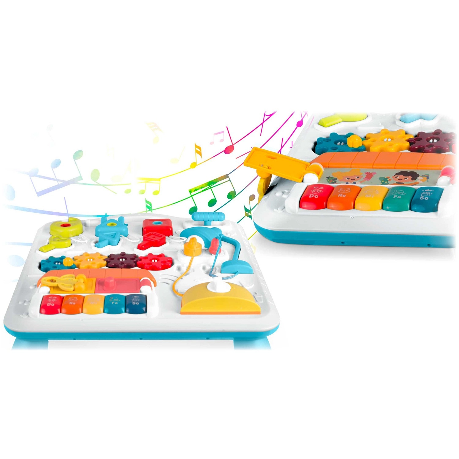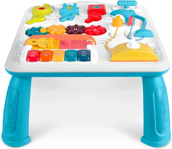 La table et le panneau pour enfants multifonctions réunis en un seul produit soutiennent le développement sensori-moteur et l’apprentissage par le jeu. Grâce au panneau amovible, l’enfant peut l’utiliser pour jouer debout ou comme panneau sensoriel portable au sol ou en voyage. Une riche palette d’éléments — petit piano avec tonalités et sons d’animaux, lampe qui s’allume, molettes, curseurs, « grille-pain » coulissant, petite maison avec porte et trois serrures avec clés — favorise la coordination œil-main, la logique et la reconnaissance des formes.