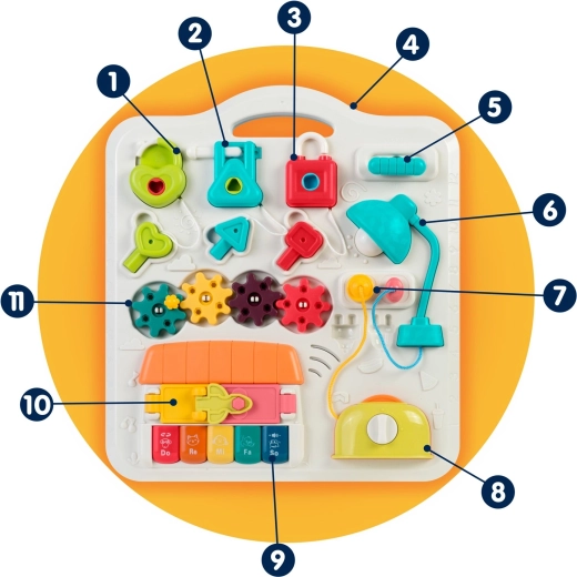 - Petit piano (tonalités et sons d’animaux), lampe LED, engrenages, éléments à faire glisser et à presser, « grille-pain » coulissant, petite maison avec porte, serrures avec clés (cœur, triangle, rectangle)