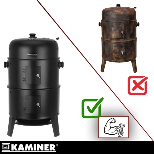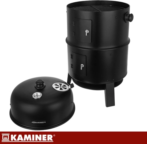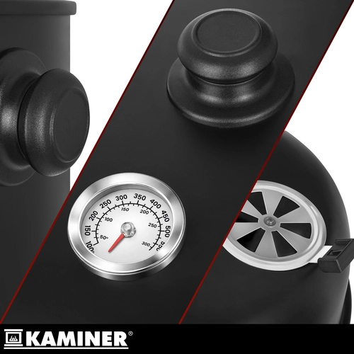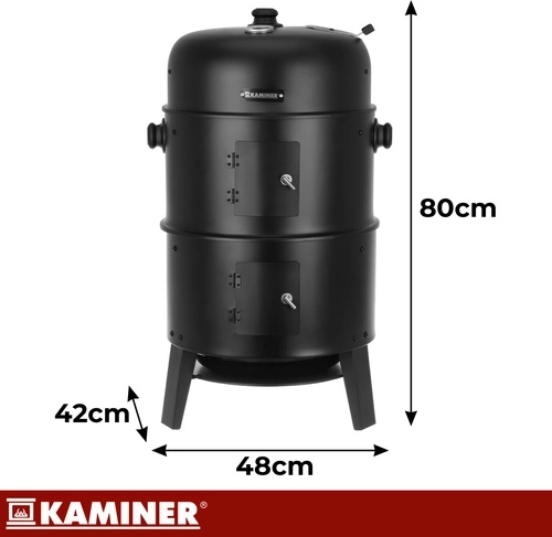 Découvrez le barbecue KAMINER 3-en-1 polyvalent, qui combine grillade, fumage et brasero en un seul appareil. Grâce au thermomètre intégré au couvercle, à la régulation de l’arrivée d’air et à deux grilles chromées de 38 cm, vous préparez des steaks juteux et de savoureuses charcuteries fumées avec un minimum d’effort. 8 crochets de fumage, une structure en acier résistante de 0,9 mm et un nettoyage facile en font le choix idéal pour tout BBQ.