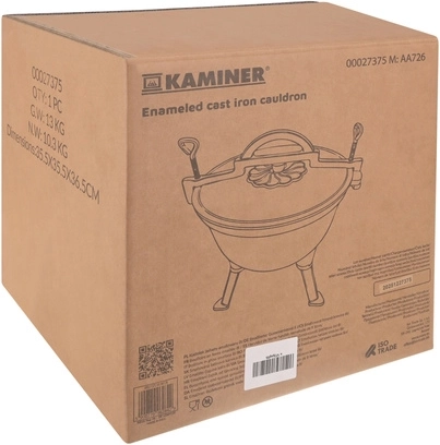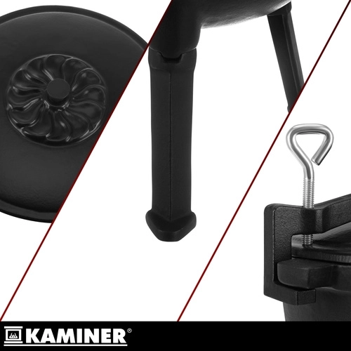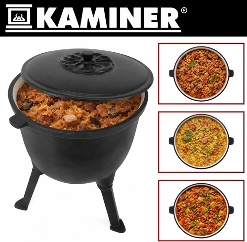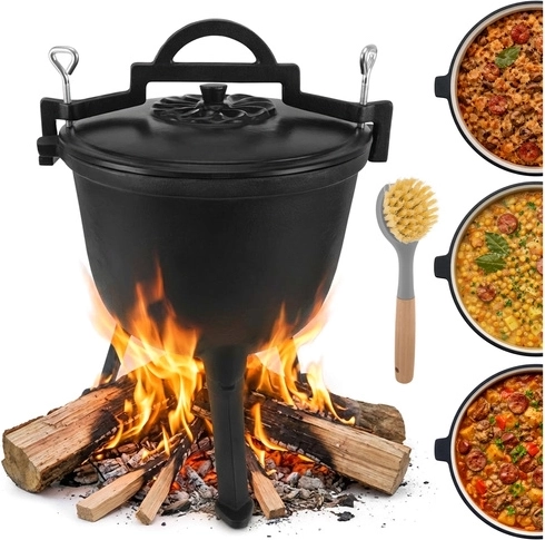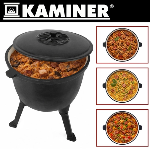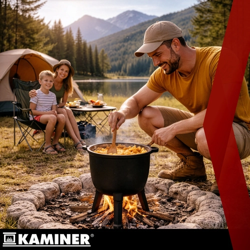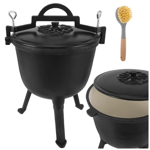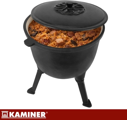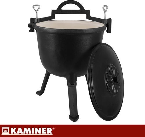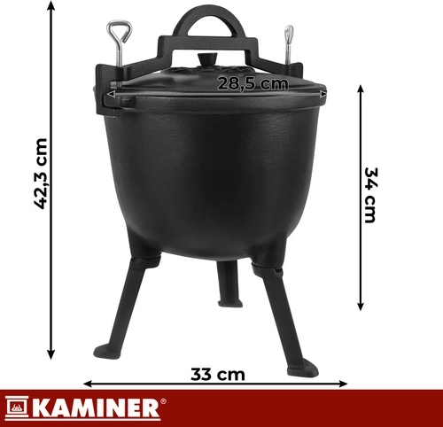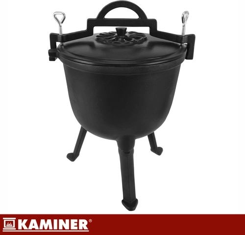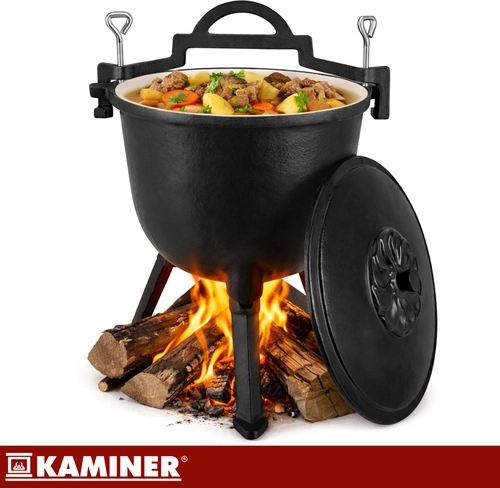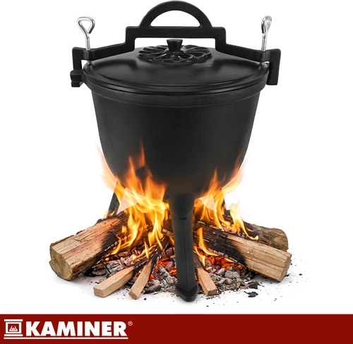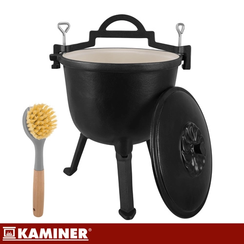 Marmite robuste en fonte d’une capacité de 8 l de la marque KAMINER, idéale pour cuisiner en plein air au-dessus du feu. Grâce à la répartition homogène de la chaleur et à l’intérieur émaillé, les plats n’attachent pas et le nettoyage est facile. Les pieds dévissables assurent la stabilité dans le foyer, le couvercle avec poignée conserve la chaleur et la anse supérieure permet le transport et la suspension au-dessus des braises. Un balai/brosse de nettoyage est inclus.