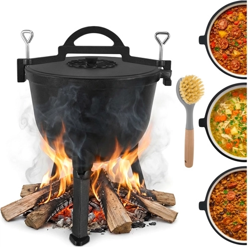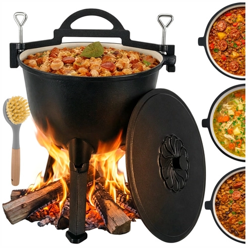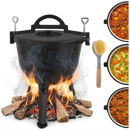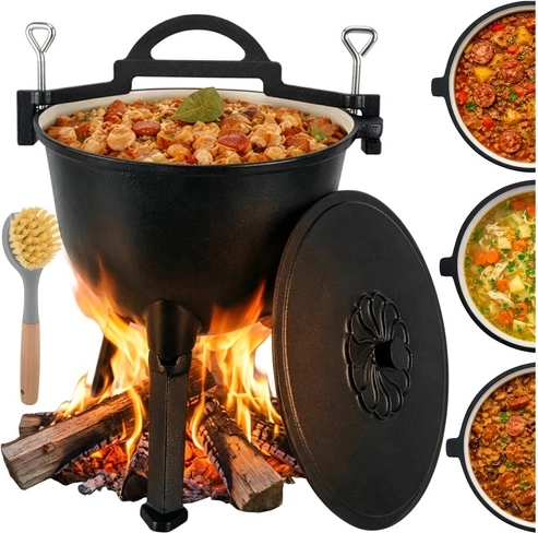 Idéal pour les plats mijotés en une seule marmite comme le goulasch, la lecsó, le ragoût de haricots, le bortsch ou les soupes. La répartition homogène de la chaleur minimise le risque d’attacher, le couvercle aide à conserver le moelleux et les arômes. Les pieds dévissables garantissent la stabilité dans le foyer et des dimensions compactes au rangement, tandis que l’étrier supérieur avec poignées permet la suspension sur un crochet ou une potence.