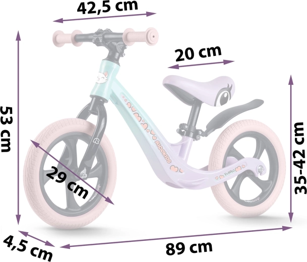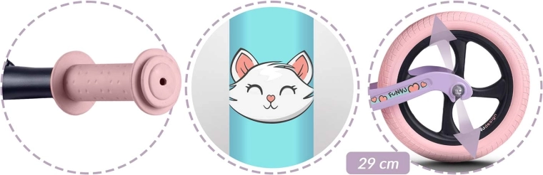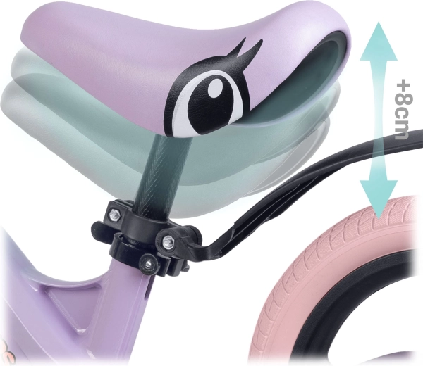 La selle souple en mousse ergonomique avec réglage continu de la hauteur (env. 35–42 cm) évolue avec l’enfant et garantit le confort à chaque sortie. Les poignées en caoutchouc avec butées offrent assurance et contrôle de la direction, tandis que le guidon large et l’empattement stable favorisent l’apprentissage naturel de l’équilibre.