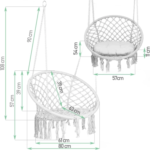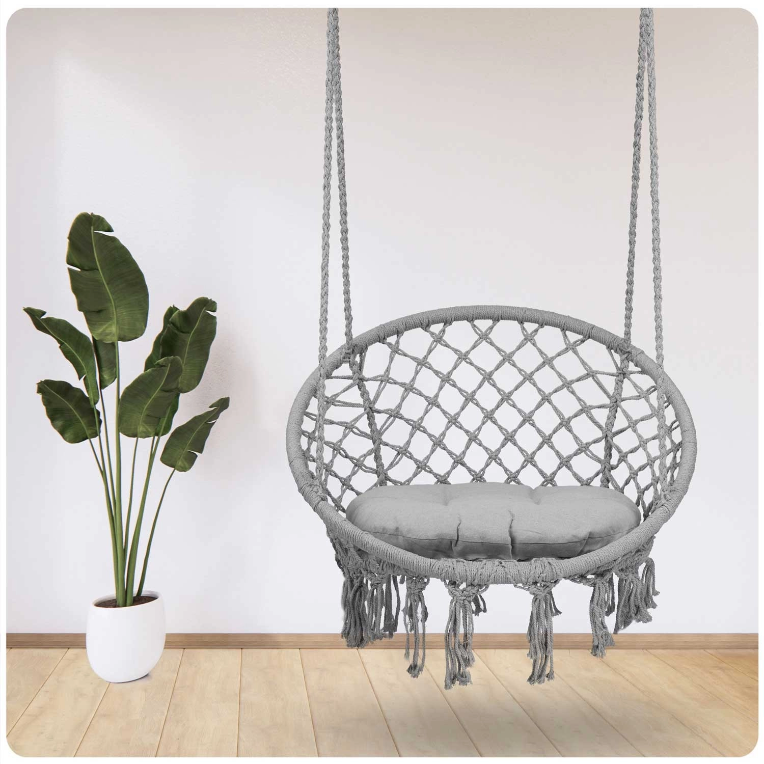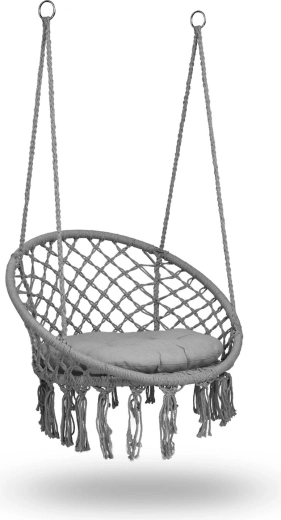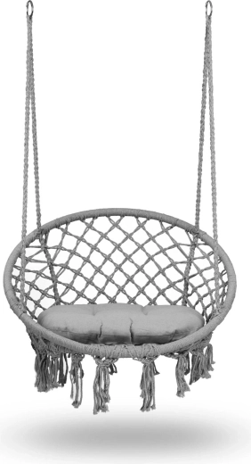 Profitez d’un moment de détente dans un fauteuil suspendu au style boho avec une assise large, un dossier haut et un coussin moelleux inclus. Sa structure métallique robuste, son tressage macramé solide et ses cordes de suspension doubles assurent une oscillation en toute sécurité, à l’intérieur comme à l’extérieur. Capacité jusqu’à 150 kg et possibilité de montage sur un ou deux points d’ancrage : le choix idéal pour balcon, terrasse ou salon.
