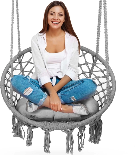 Le fauteuil suspendu au design boho moderne allie confort et style pour tous vos espaces, intérieurs comme extérieurs. Son assise ergonomique de grand diamètre avec dossier plus haut soutient le corps, tandis que le coussin doux assorti renforce le confort pour la lecture, la détente et un léger balancement.