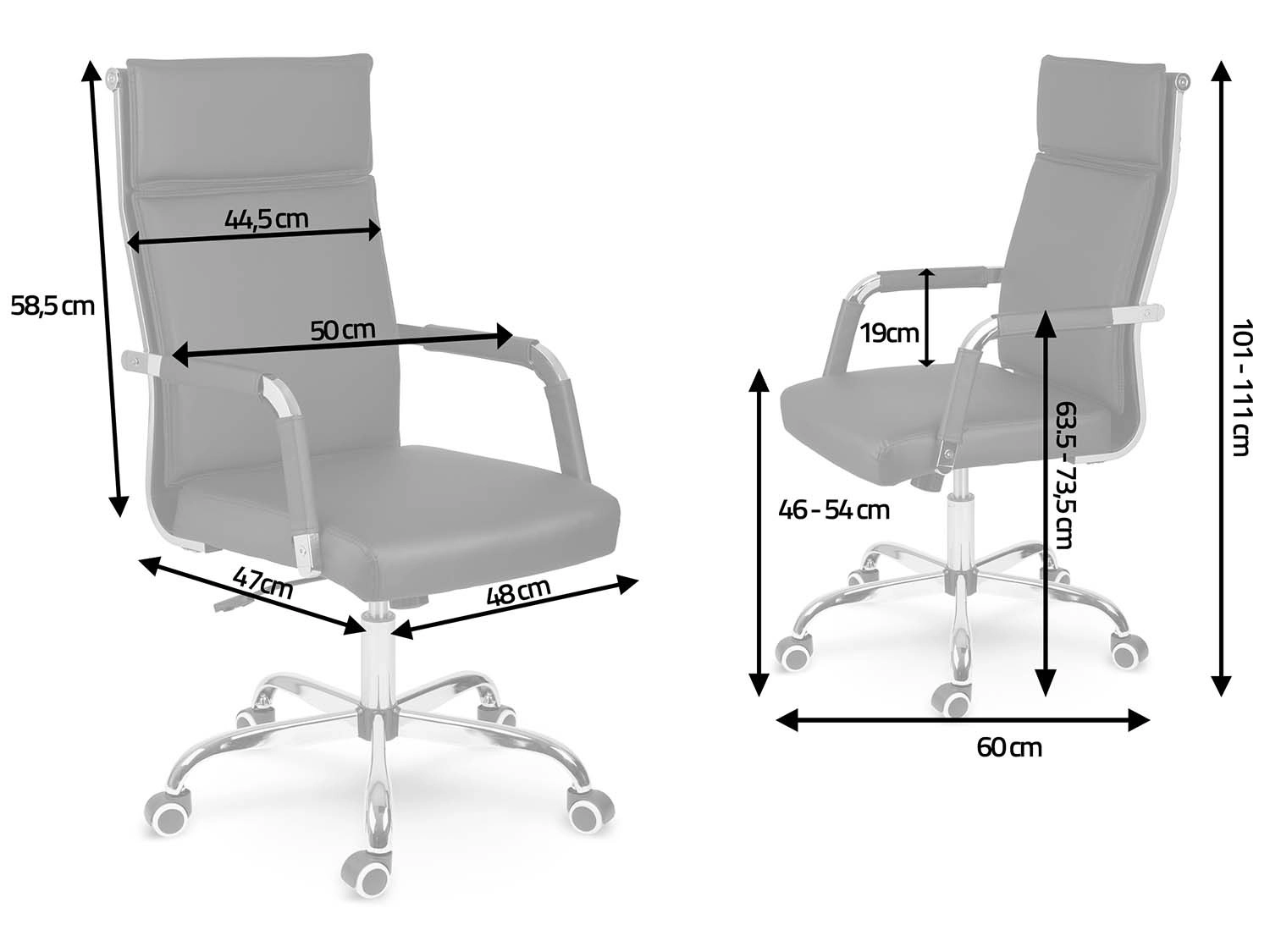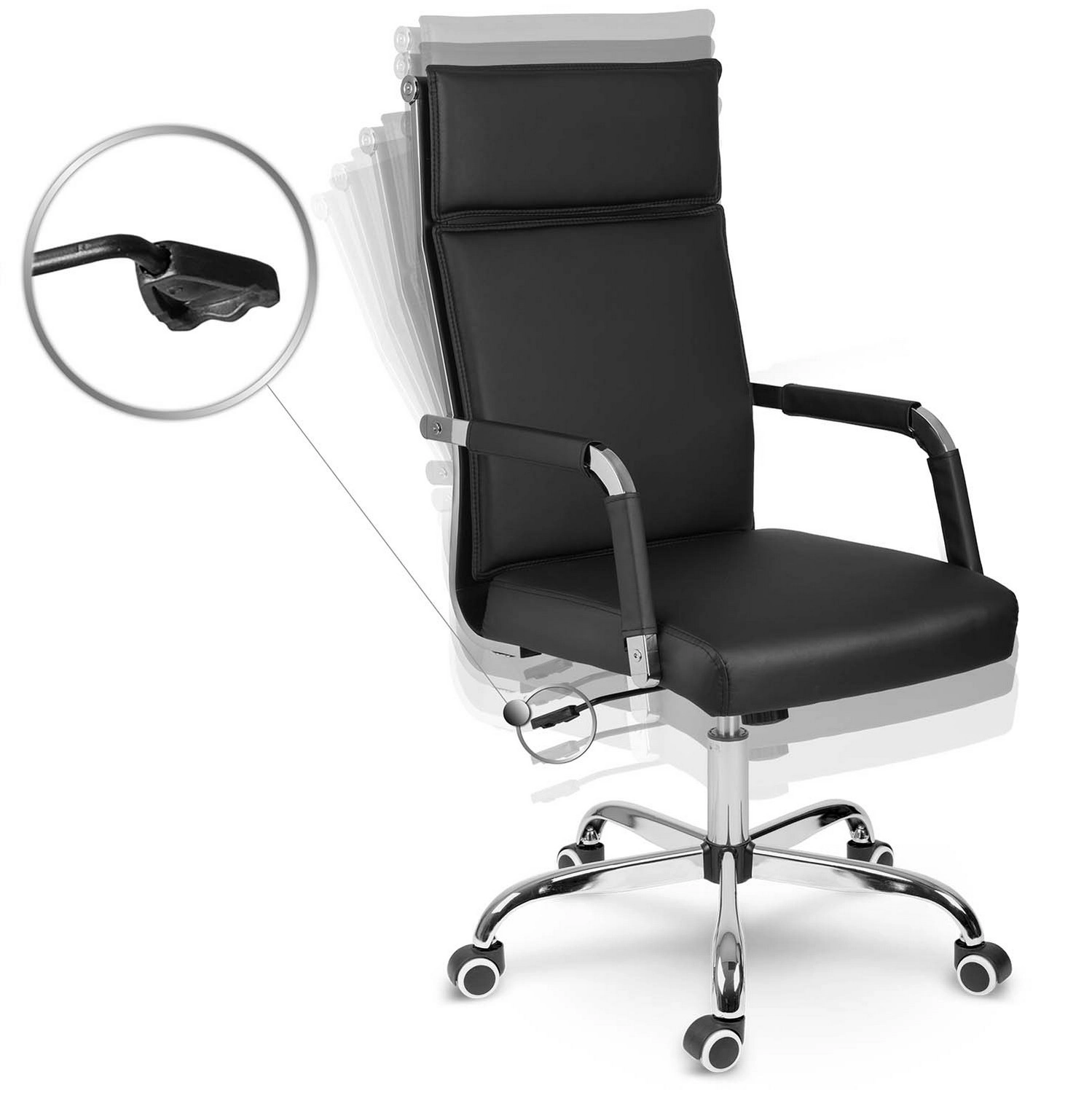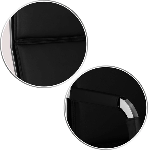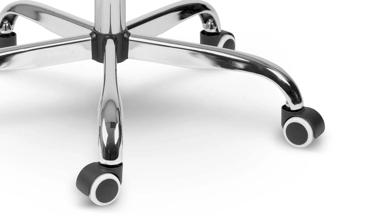 La base stable à cinq branches en chrome et les roulettes doubles silencieuses protègent le sol des rayures et assurent un déplacement en douceur.