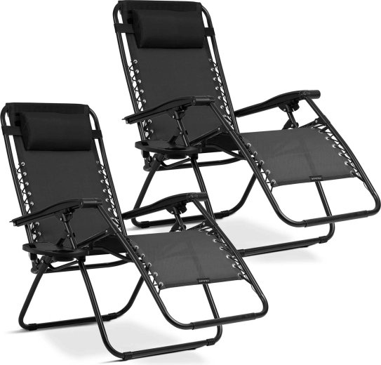 Chaises longues de jardin gravitationnelles pliantes avec coussin et tablette, lot de 2, noir