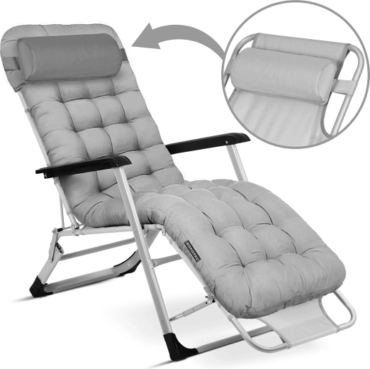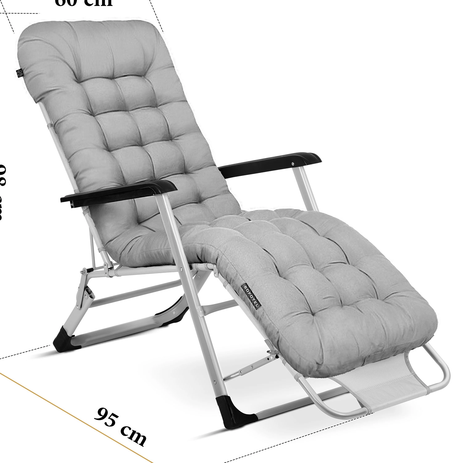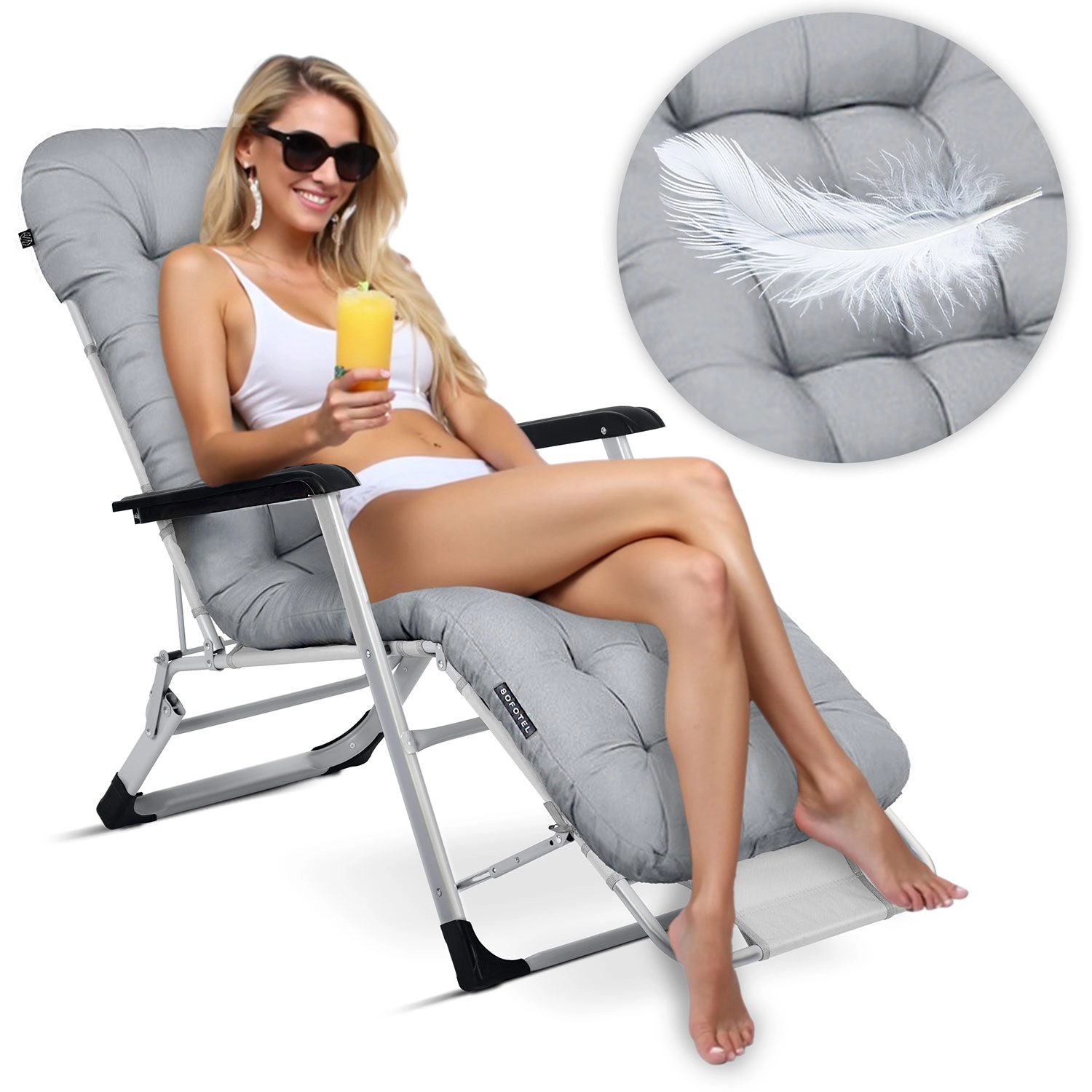 - Détente modulable : réglage fluide du dossier et 3 niveaux de repose‑pieds, possibilité de s’allonger complètement.
