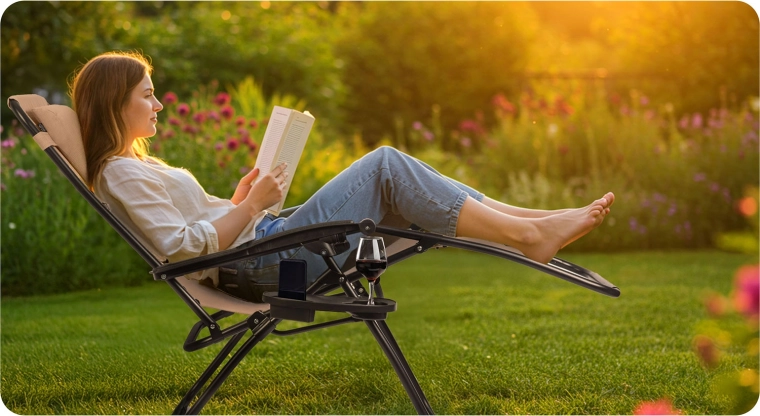 Un plateau intégré avec porte-gobelet et espace pour téléphone ou livre garde l’essentiel à portée de main – sans renversement ni recherches.