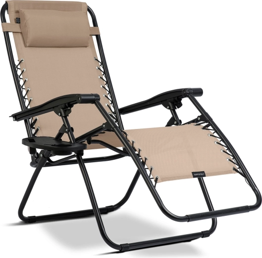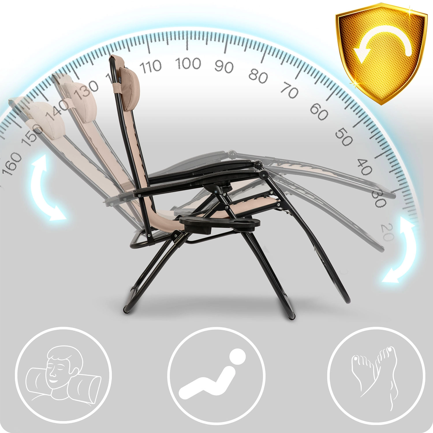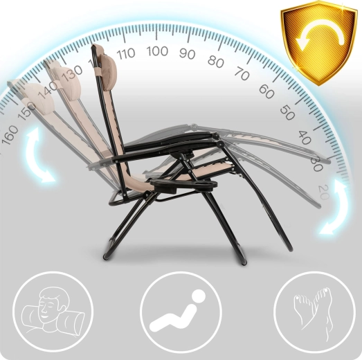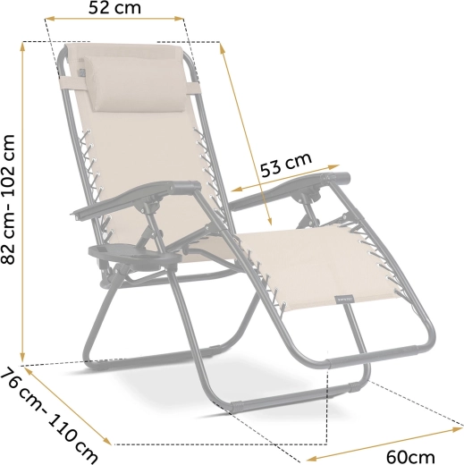 L’équipement pratique comprend un coussin d’appui-tête amovible et une tablette latérale avec porte-boissons et espace pour téléphone ou petits objets – tout reste à portée de main. Le cadre en acier stable avec revêtement par poudre et les cordons de tension garantissent une assise et une position allongée sûres jusqu’à 120 kg.