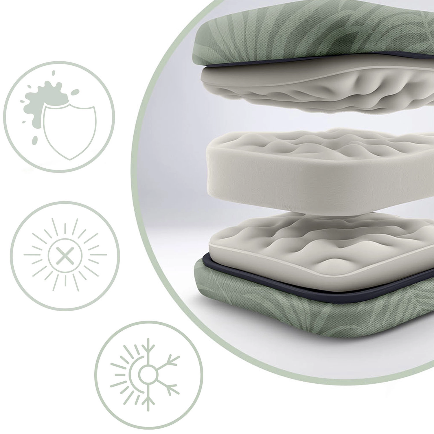 Coussin doux, souple et matelassé avec une agréable housse en Texline, offrant un confort tout au long de la journée et résistant à l’affaissement comme aux UV.